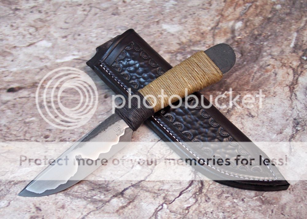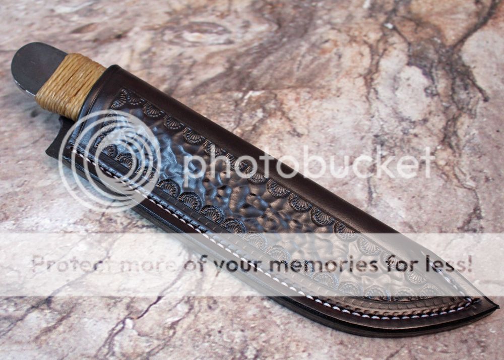 The sheath is 7-8oz hand tooled leather from Wickett and Craig. The knife holds nicely and draws easily.