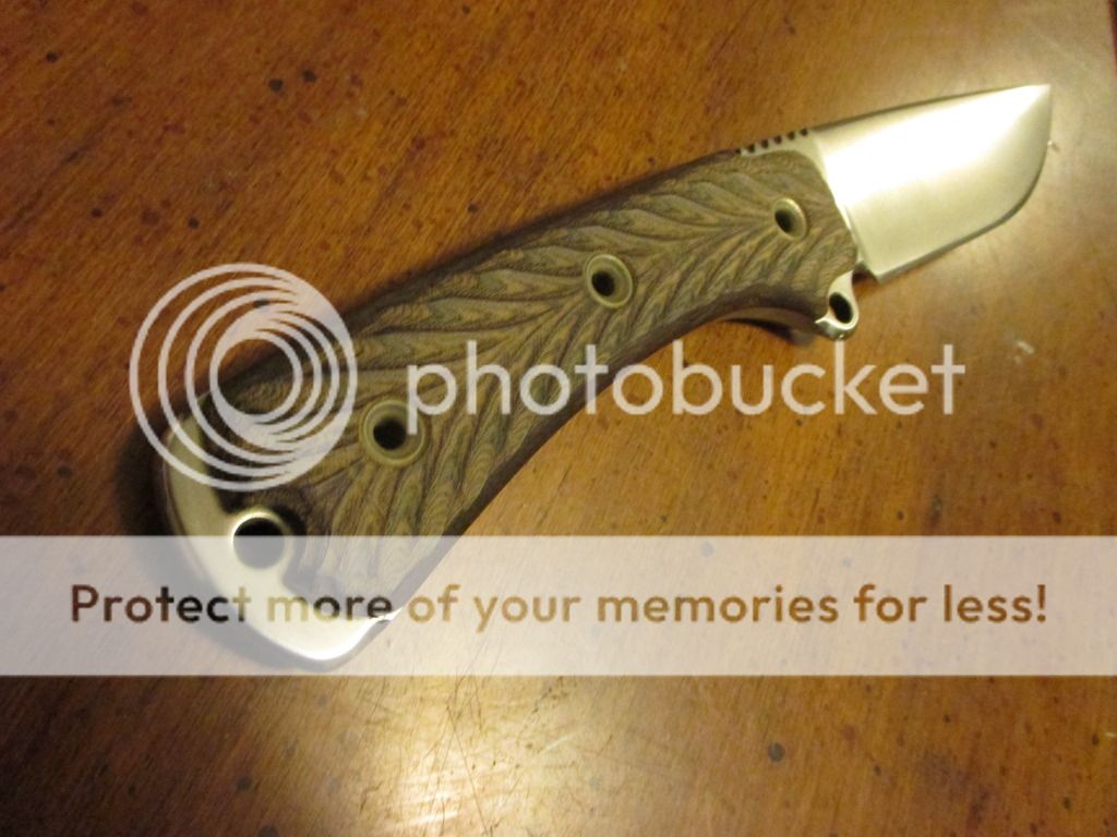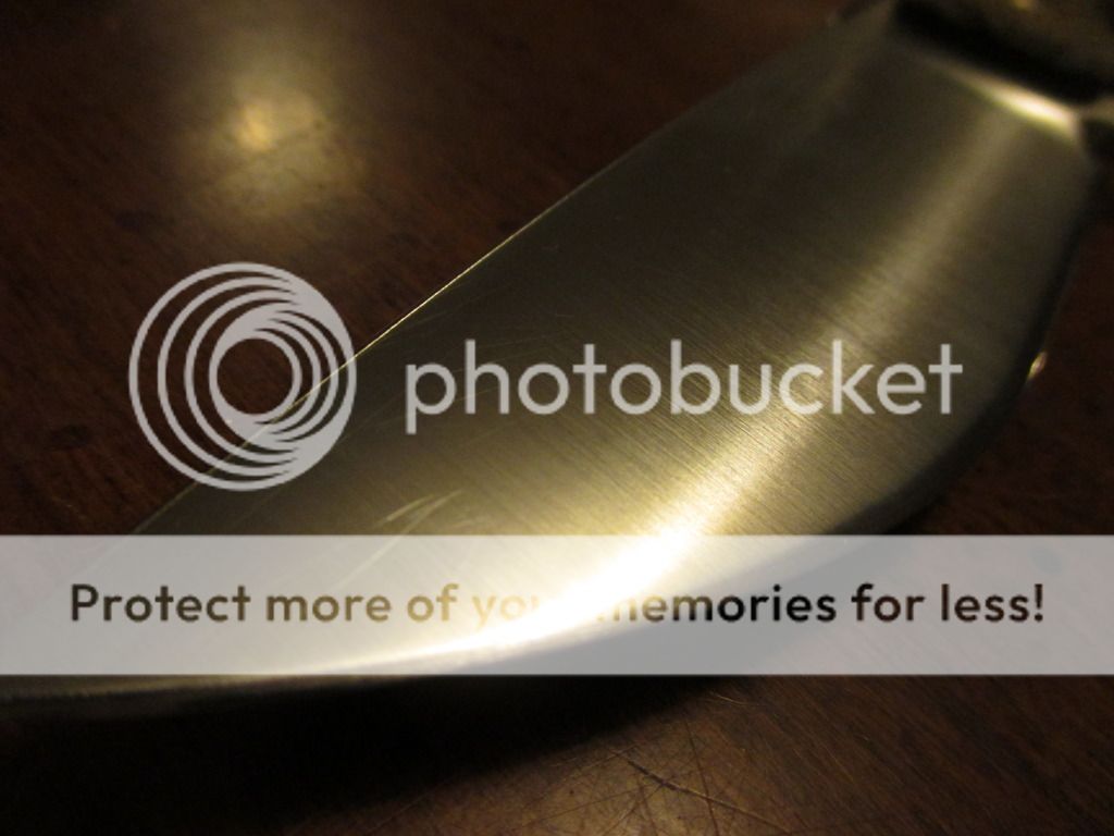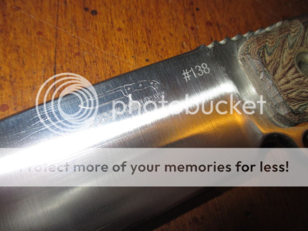 BUT its spent most of its life in a leather sheath(not included), so there are those faint scratches that come from that sometimes (they aren't really bad, but the one right under the Busse logo is noticeable- I took pics of it the best I could---you can see the faint scratches and the bigger one in the pics)