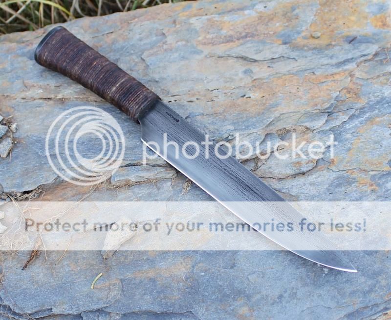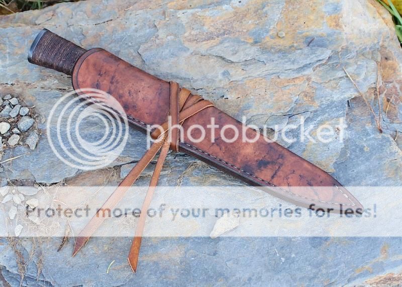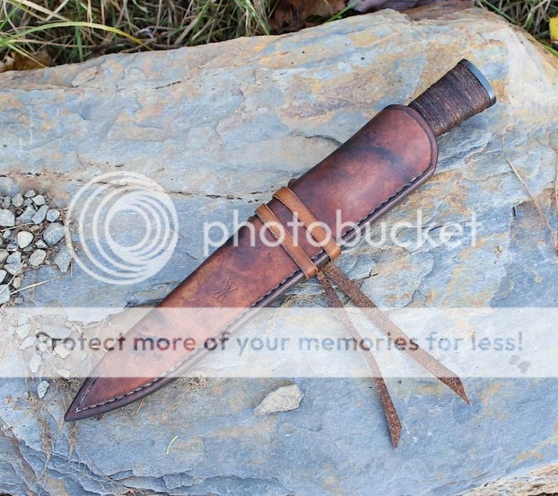 Sheath is leather "sash carry", hand stitched, dyed and wax dipped.