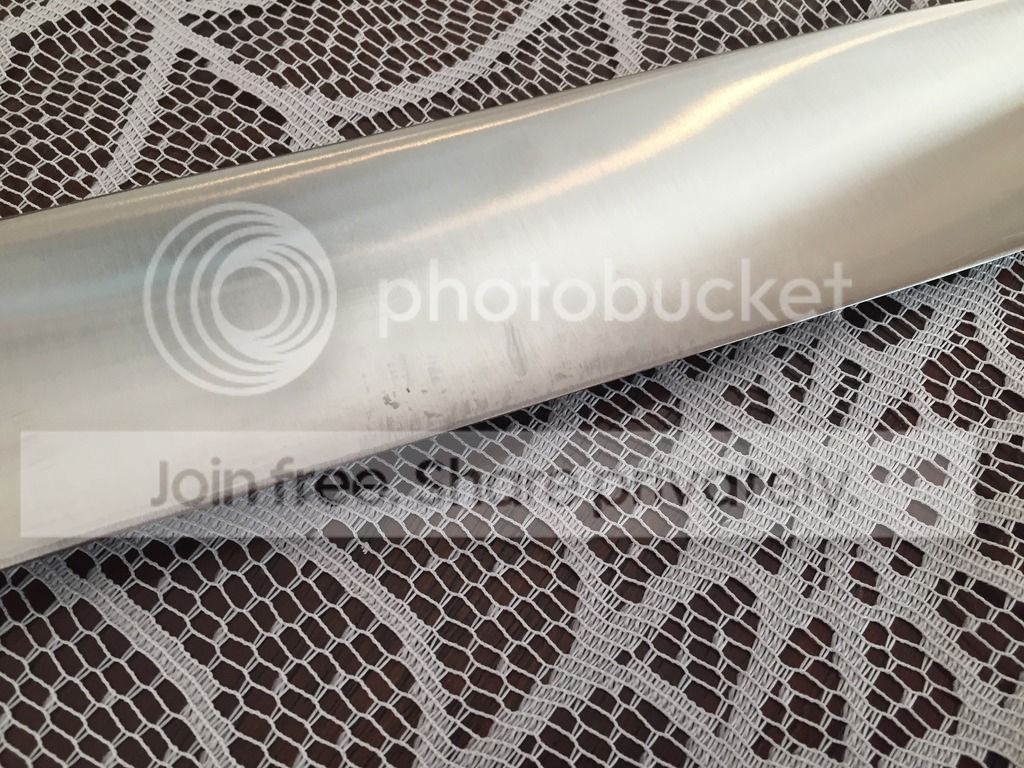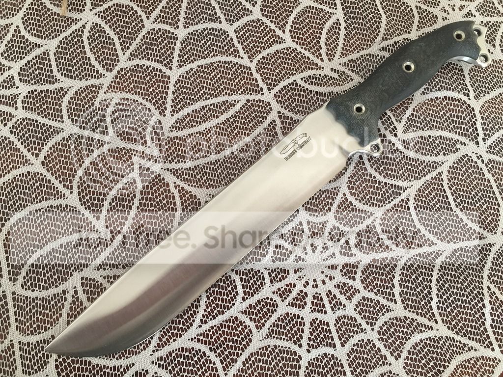 This one is .24" thick, was stripped and satin finished by Busse Shop. It has been used once chopping shows wear as seen in pics. There are some marks on both sides as well from kydex sheath(hard to capture), comes with Buy Brown sheath with teklock.