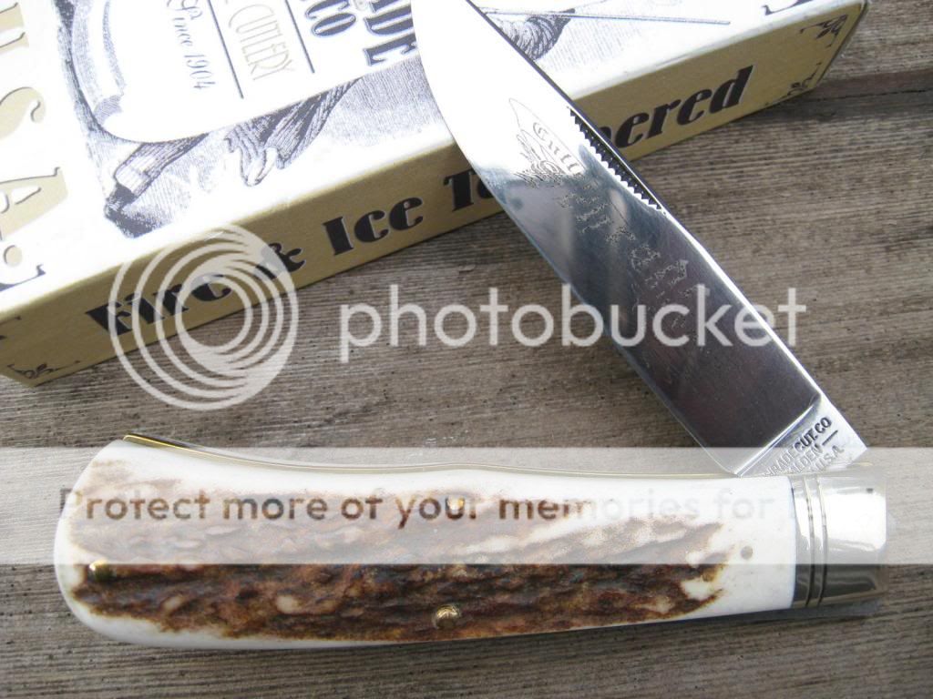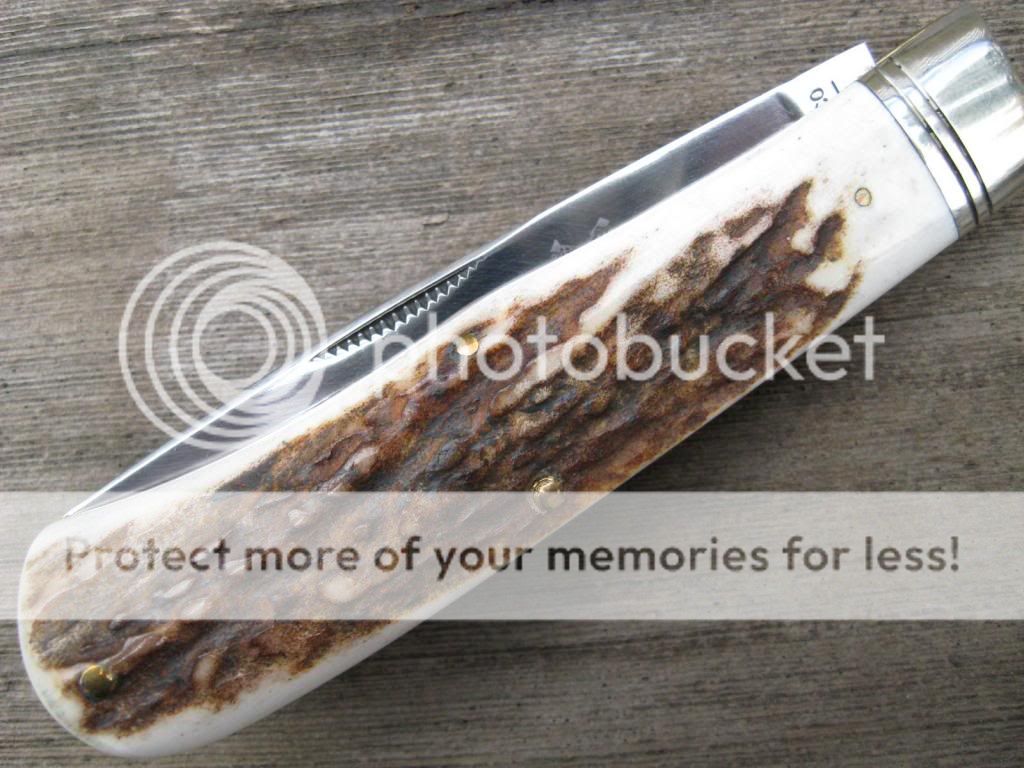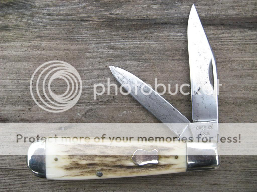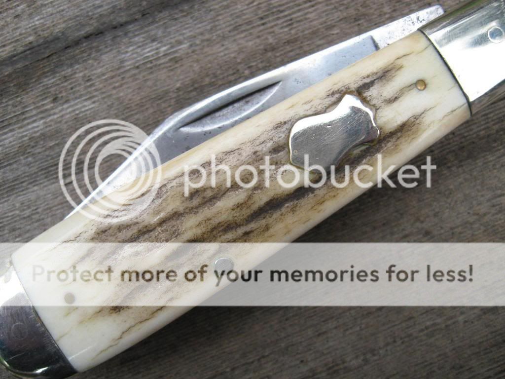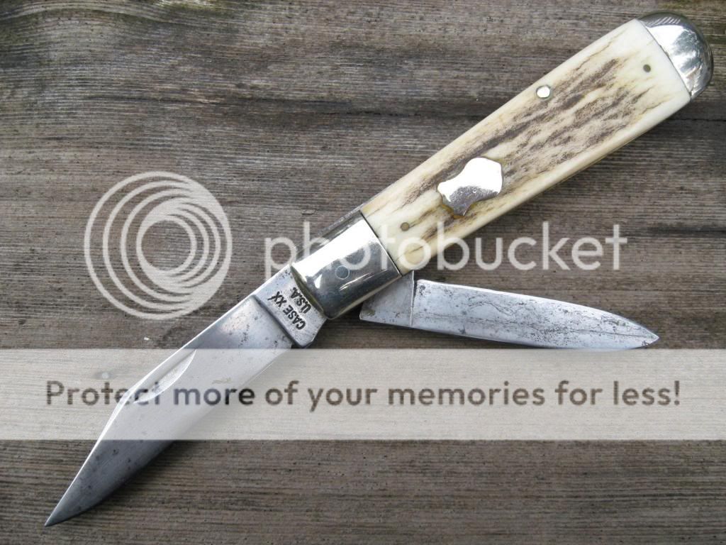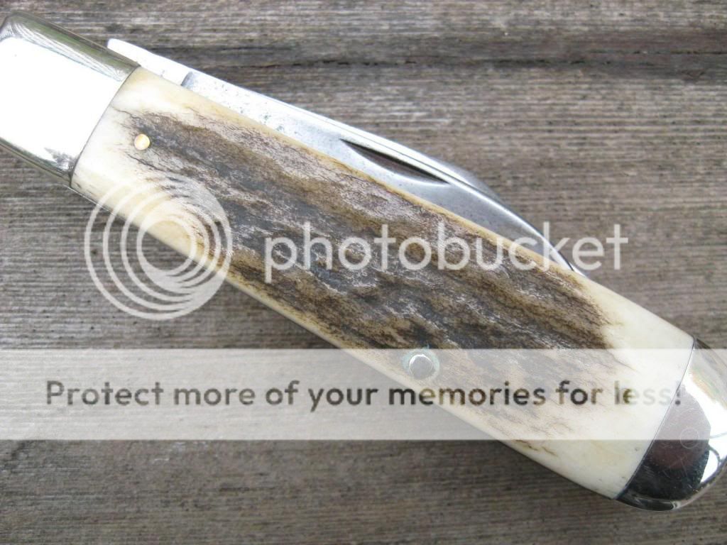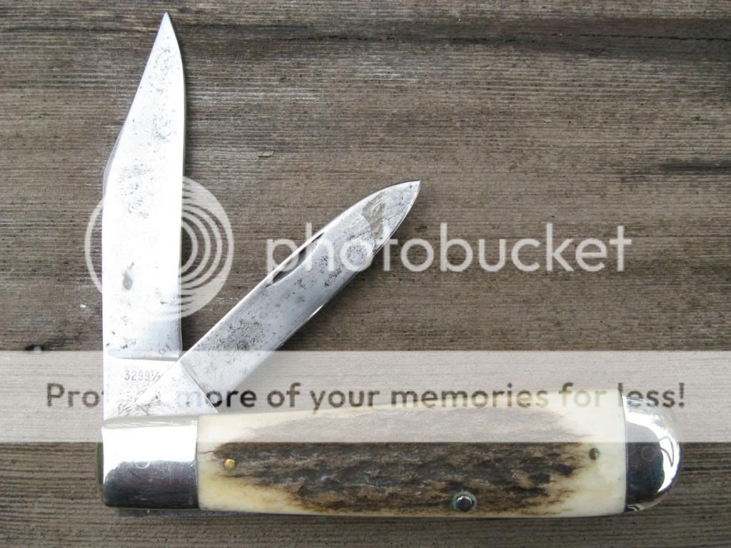 This CASE is an old knife out of my accumulation and it has seen plenty of use, but is good for plenty more. Solid knife with about 25% blade loss on the clip. I did the mod on this knife, and the scales have been replaced with Montana Mule Deer Stag and I pinned on an old Schrade Heraldic shield just to give it that old timie look. Makes for a neat old knife that nobody else has! Bargain priced at $55 and I'll include the shipping and PP fees. Now $45