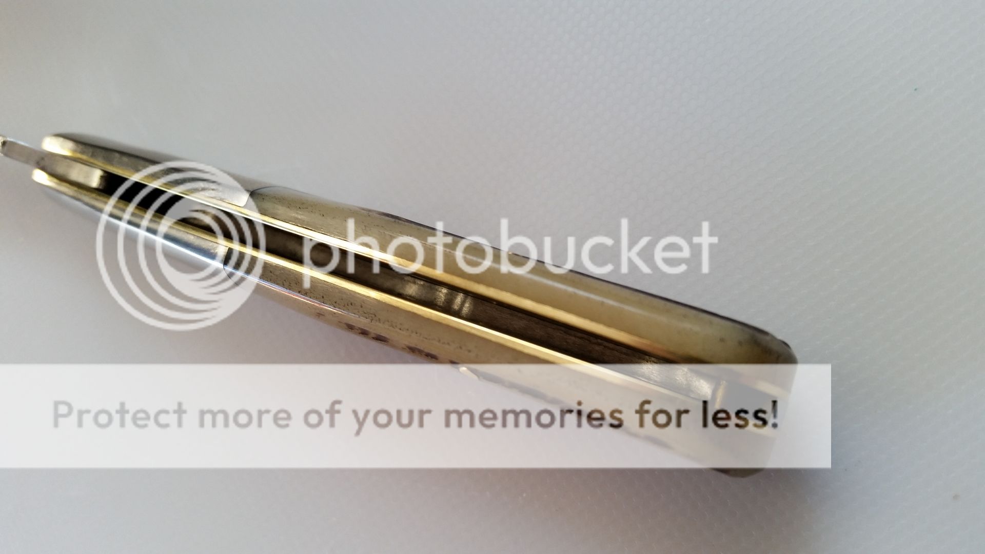 This picture bothered me a little as I have paid fairly close attention to the shields on GEC knives. Confirmed with the factory that they only used this method the first year or so. For the last many years they have used shields w/pins that look, for the most part, like the hat pins that come with Genuine Stag models.