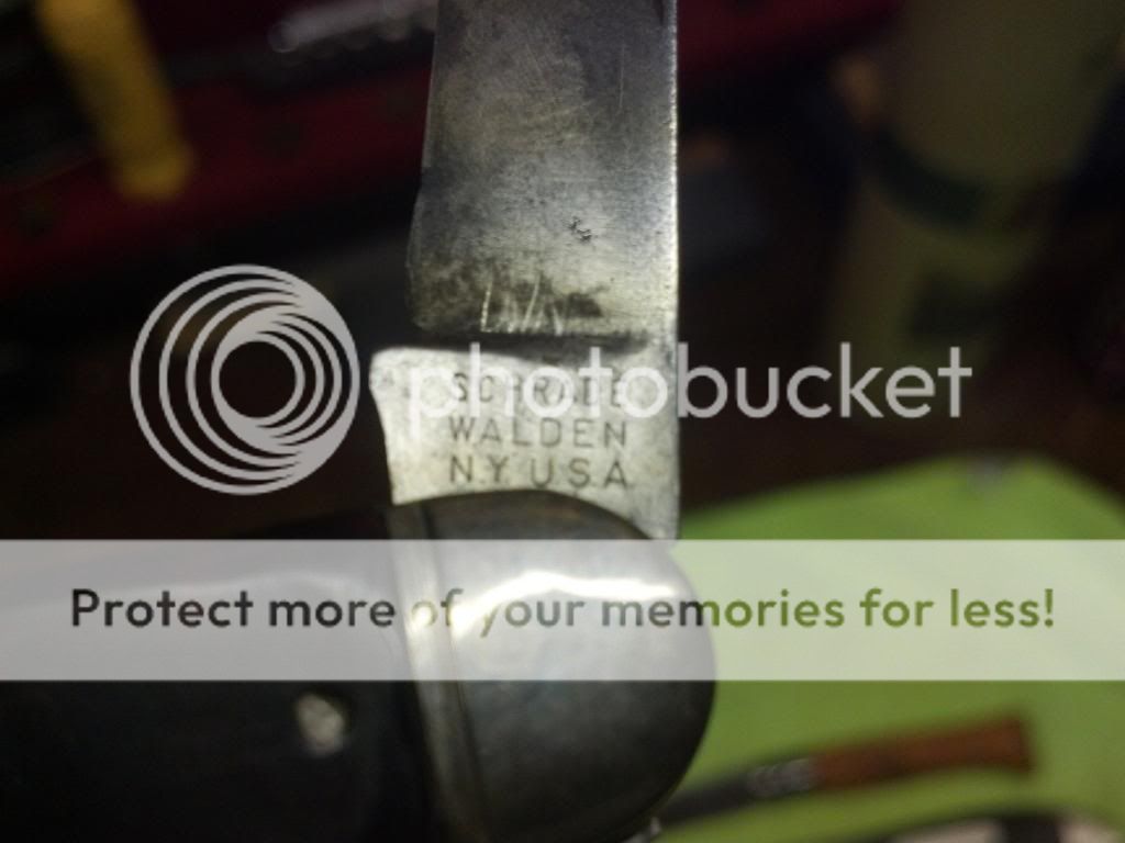 3) Schrade Walden NY USA Model 716. Someone has put different handles and shield on the knife. One blade has a lotta snap the other not so much.