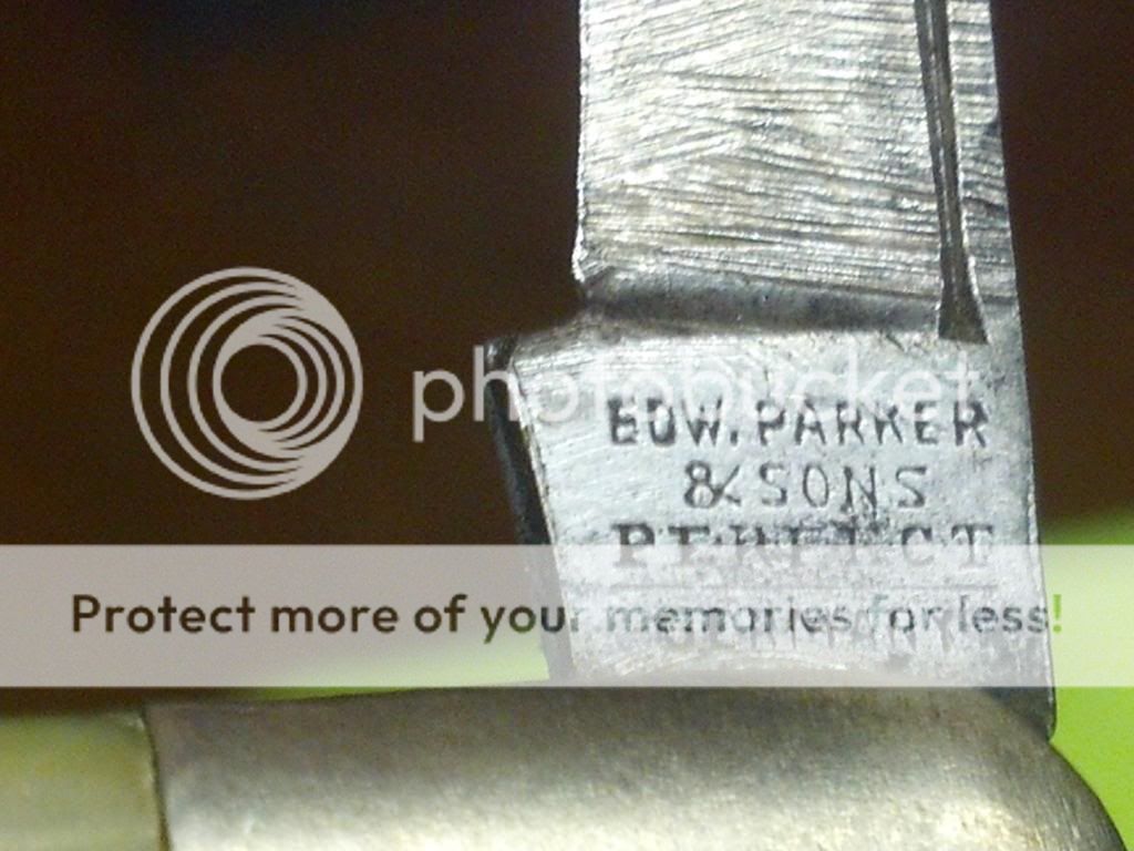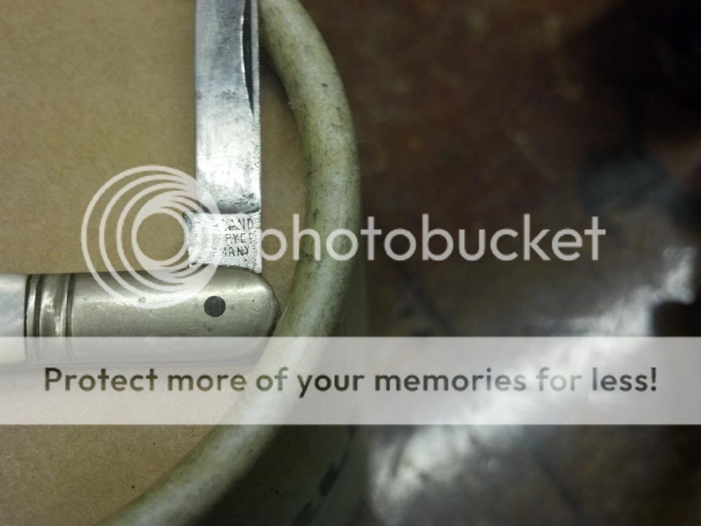 4) Larger of 2 small pearl handle knives, 3 1/8 inches long closed " EDW Parker & Sons PERFECT Germany stamp blades are tight but not much snap and has seen a grinder .