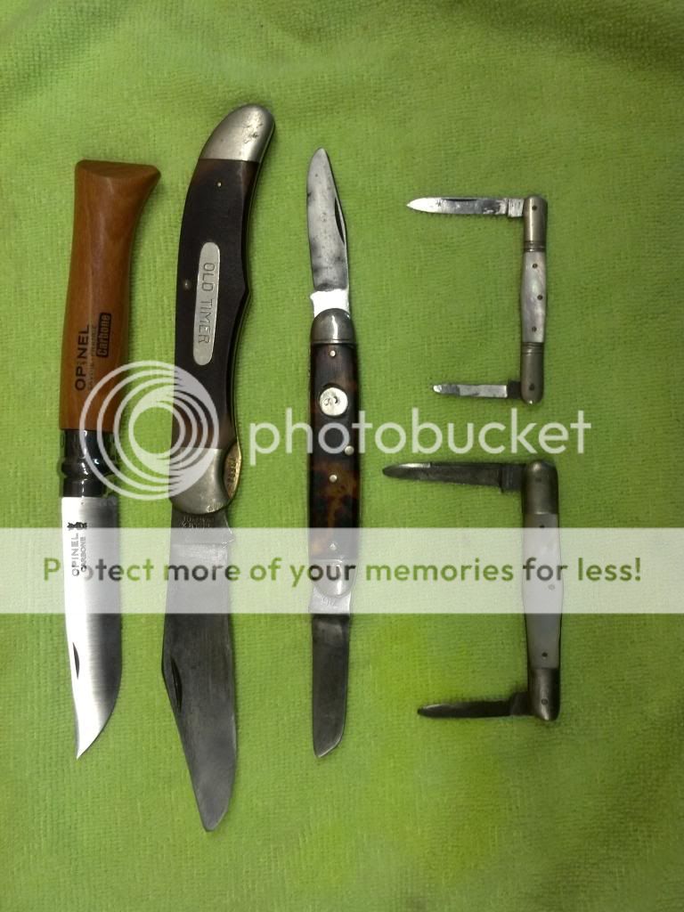 2) Schrade USA old timer 125ot. Blade tip has been broken and reshaped blade wobbles a bit and has seen a grinder or some sandpaper. Liner lock and it works.