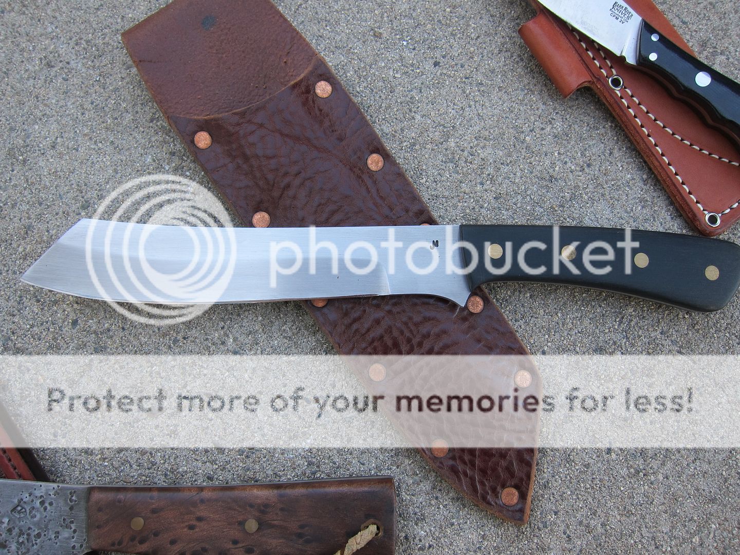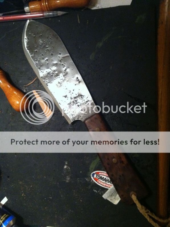 Here is a rough-forged user I made from 0.095 15n20. 12" OAL, 6.5" blade. The blade is 2 1/4" at it's widest. This was stock removed but placed into the forge for hammer texturing. It was designed to be a low profile, light-weight camp knife that would fit easily into a pack and disappear on your hip. Even with the thin blade (0.095 is just less than 1/8") it makes a great chopper due to the wide blade