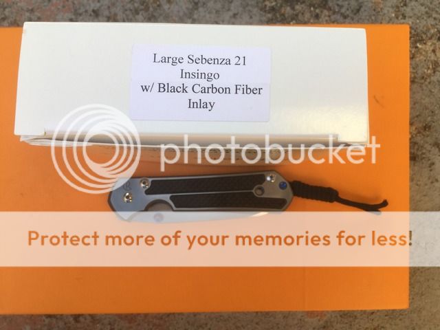 Large Sebenza 21 Insingo w/Carbon Fiber inlays. Birthdate - November 4, 2013 I bought this brand new from a very well known knife dealer. It has been carried, but I never cut anything more than paper. Still has factory edge. As you can see from the pics it has some trails on the clip and scale. This is from slipping it in and out of my pocket. Comes with everything. Box, birthcard, and towel. Price-- $OLD
