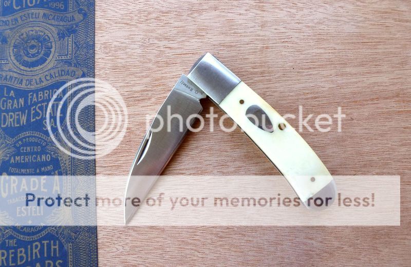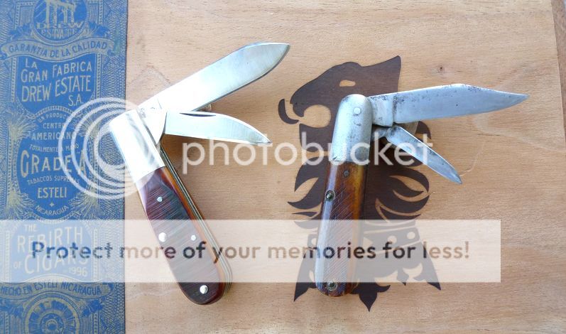 Bearing that in mind, recall the old knives such as Barlows that were a working man's knives that were advertised in the old ads as having "second cut" bone on them. I have a 30's vintage Barlow Keen Kutter that has second cut bone scales and they didn't even buff out the saw blade marks. Likewise, the same effect was tried with the Dan Burke Barlow I have where they left the saw marks on them as well. You cannot see them due to the poor photos, but in person you can EASILY se the marrow holes on the DB's scales. I lightened these up a lot so you could see (hopefully!) the saw blade marks left on the scales.