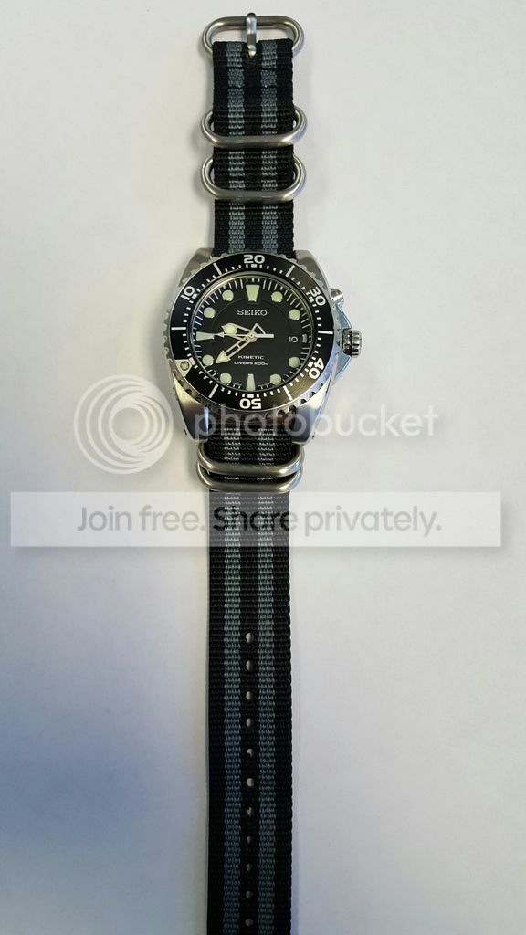 Up for sale is my Seiko kinetic SKA371 (BFK) with James Bond (black & gray striped) 5-ring Zulu band. Black dial, 42mm case. Box, paperwork, and 20mm factory bracelet (solid end links) included.