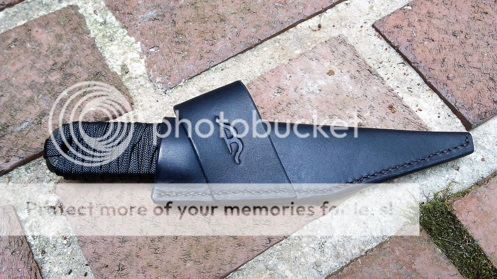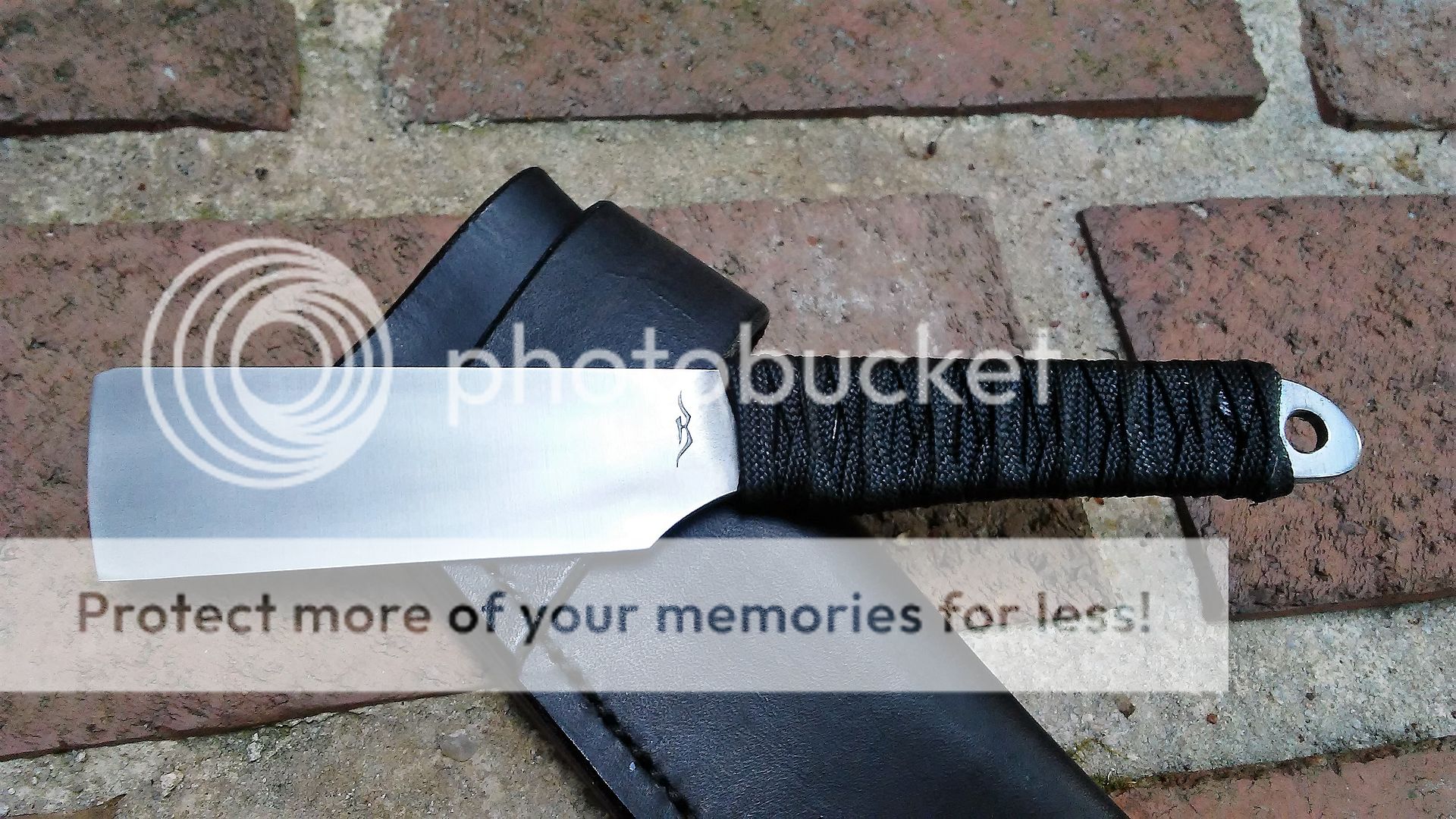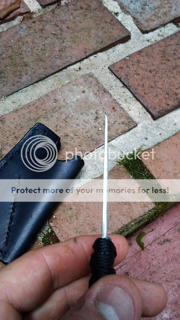 This self defense razor is made from AEB-L stainless steel. The blade is ground with a right side chisel grind and the end is sharp. The handle is wrapped with black cotton paracord that was soaked in resin. It comes with a black leather cross draw sheath.