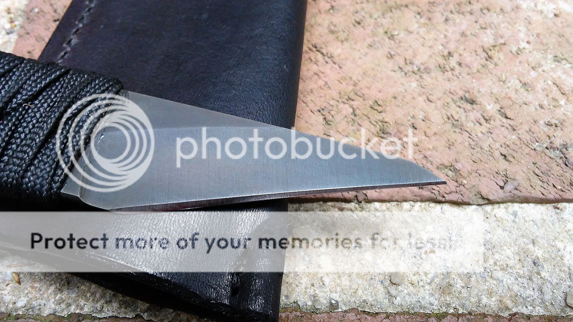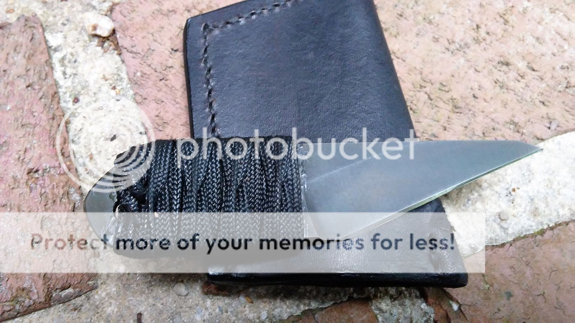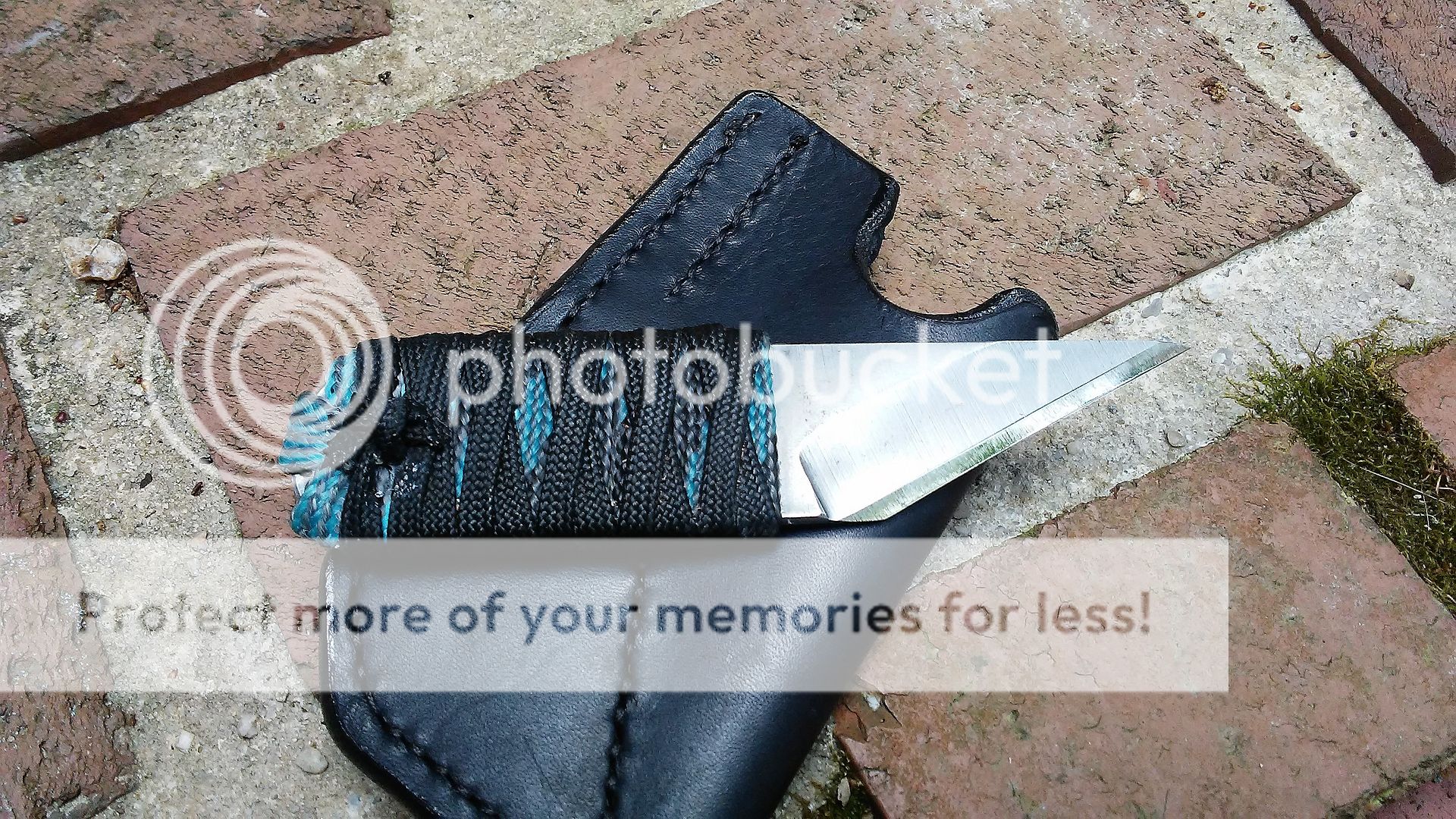 This self defense razor is made from AEB-L stainless steel. The blade is ground with a right side chisel grind and the end is sharp. The handle is wrapped with black cotton paracord that was soaked in resin. It comes with a black leather cross draw sheath.