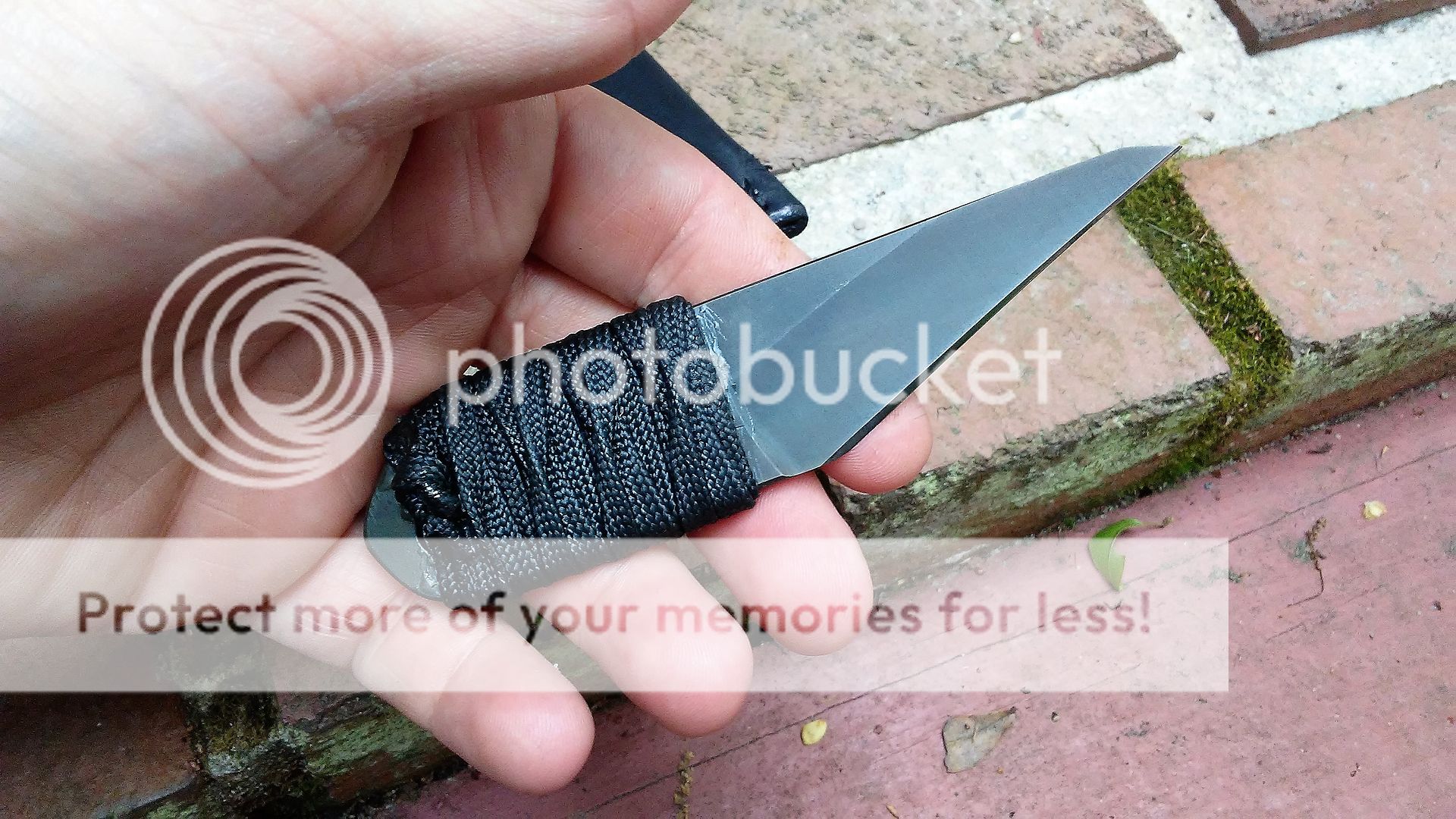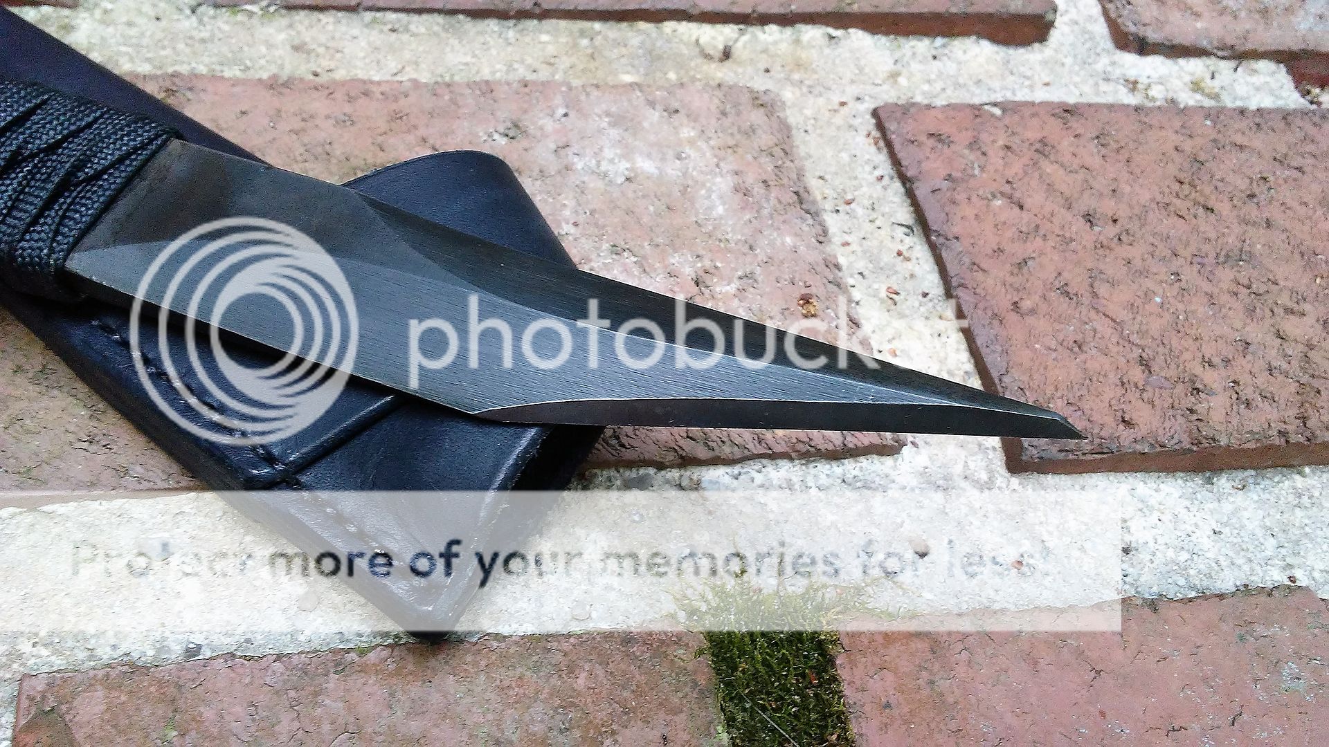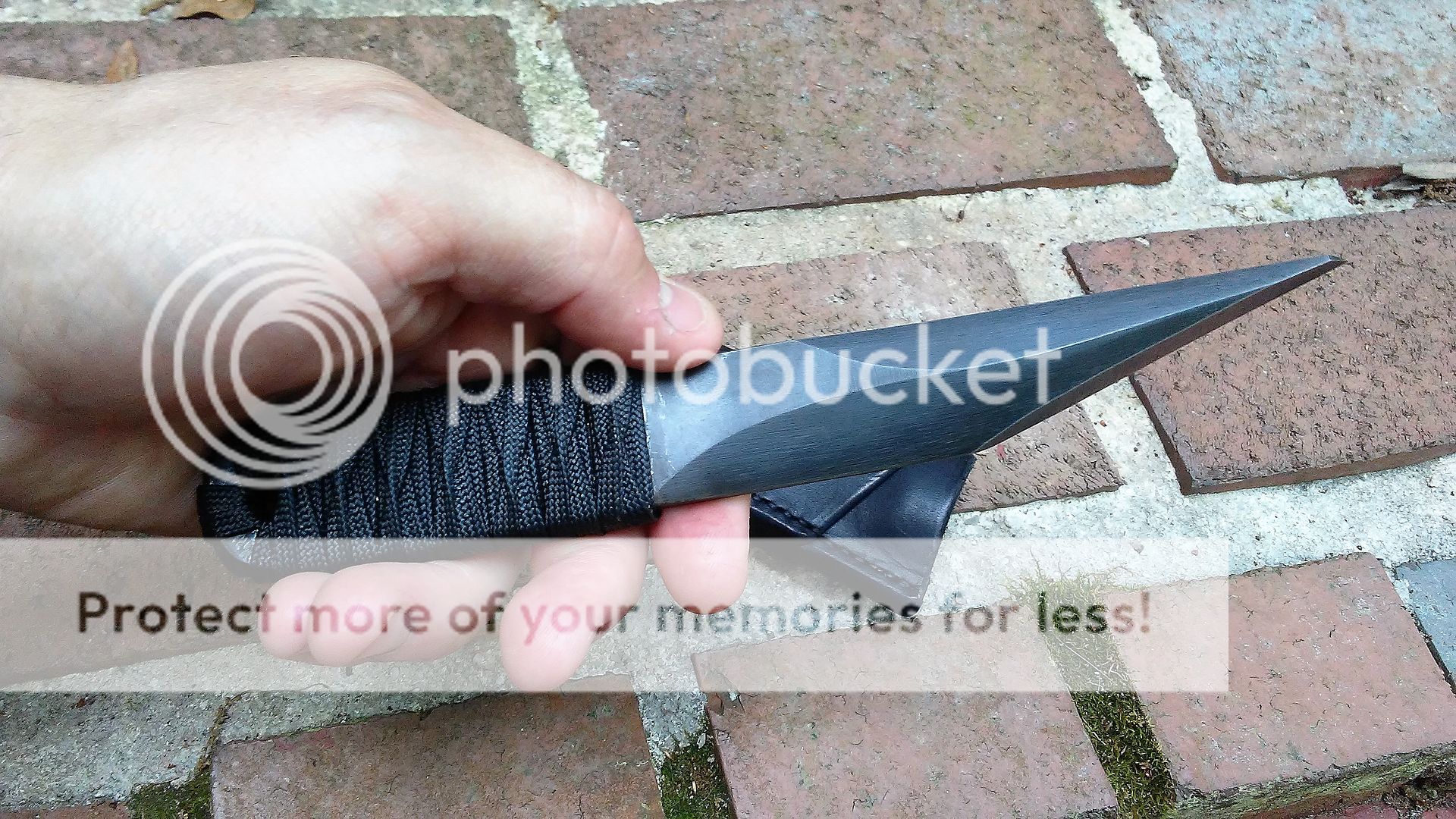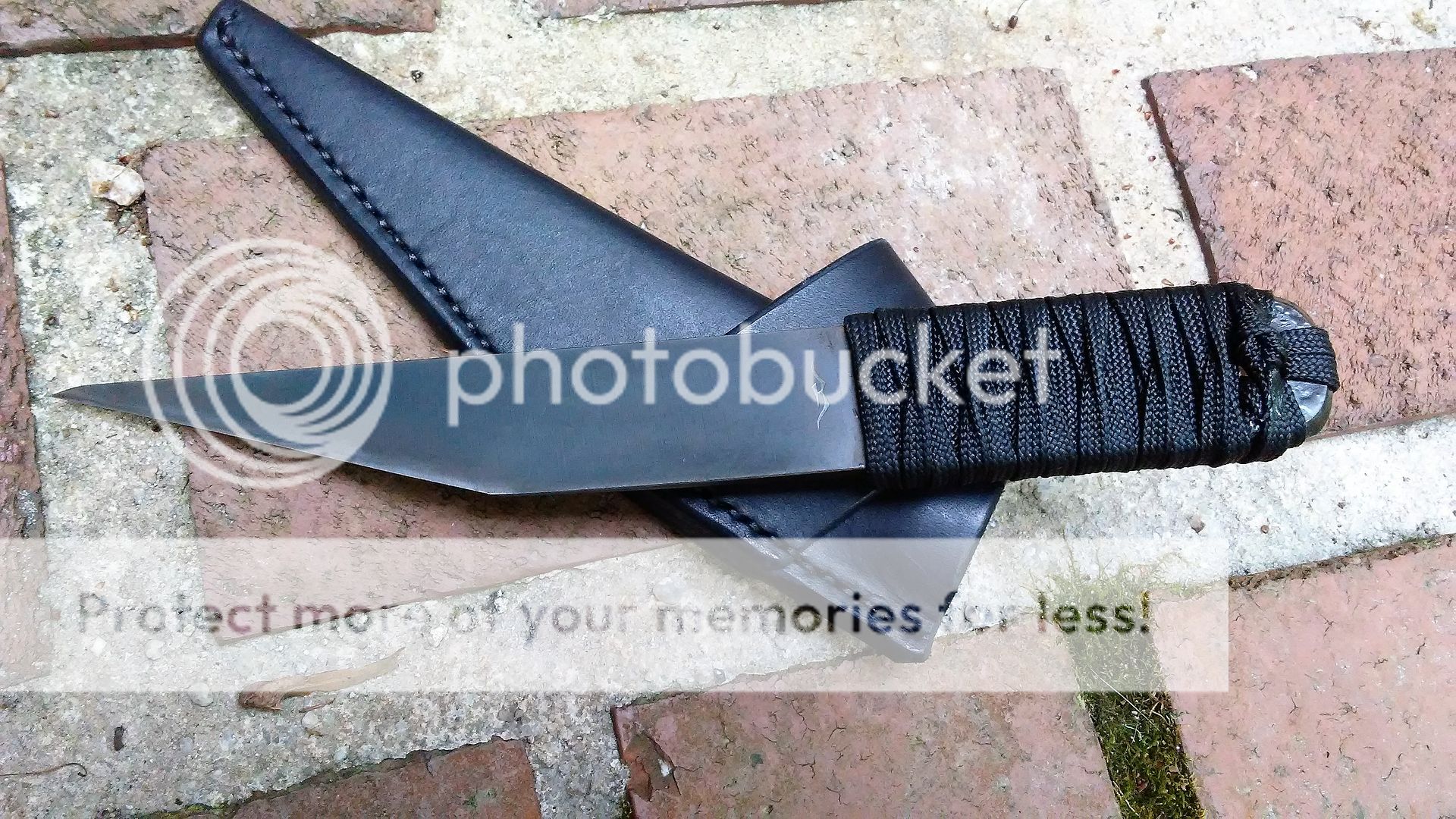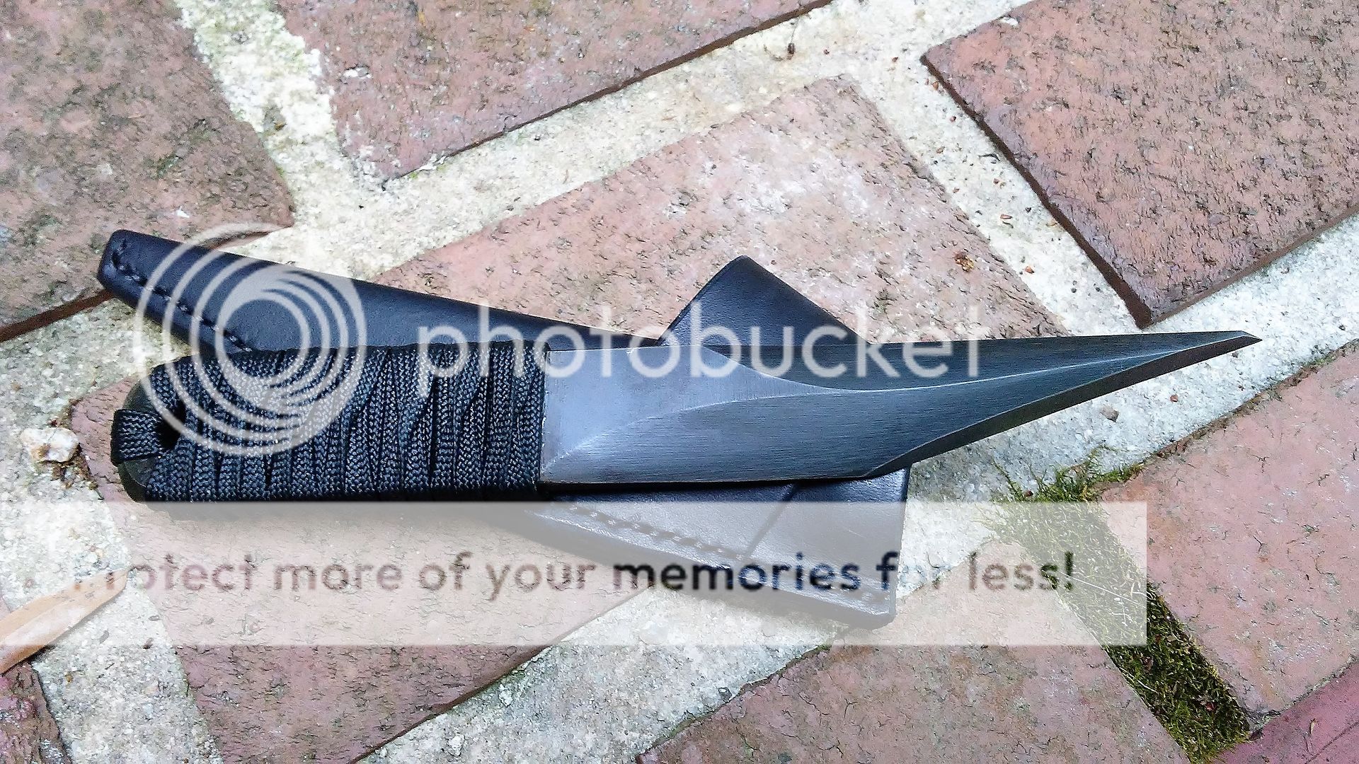 This combat kiridashi is made from 1095 carbon steel. The blade is ground with a right side chisel grind on top and bottom. Only the end of the knife is sharp. The reason for the grinds good so far back is to air in stabbing. The handle is wrapped with black paracord that was soaked in resin. It comes with a black leather cross draw sheath.