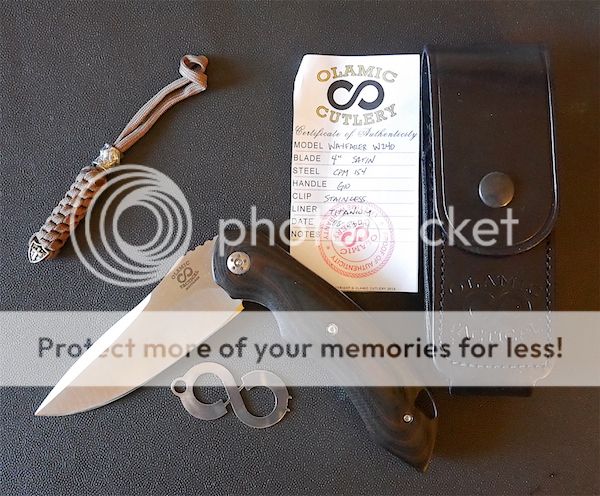 Olamic Wayfarer W240 Black and red G10 handles, satin finished CPM154 blade. This coms with the Olamic sheath, a leatherette pouch, lanyard, tool and CoA. The knife has been carried once or twice by me and possibly the original owner but shows no signs of use at all. Centered, lockup detent all good. Was $425. Now $350