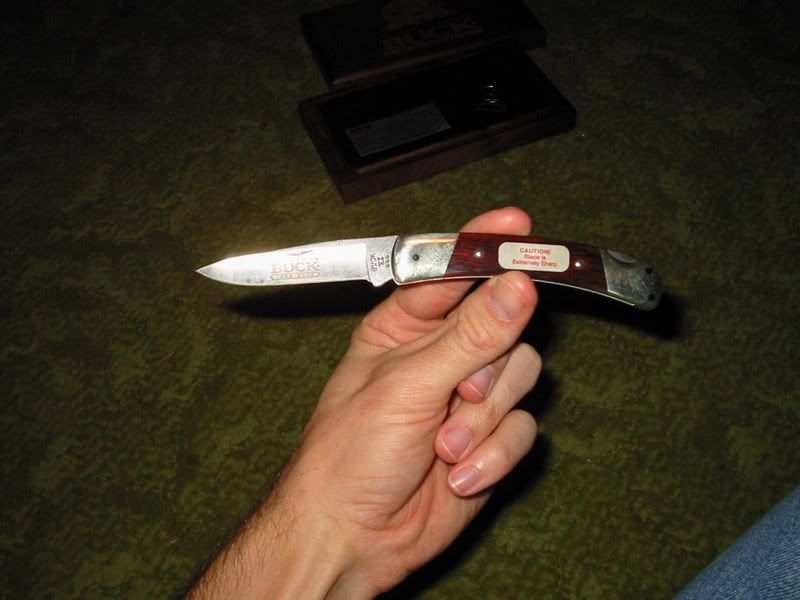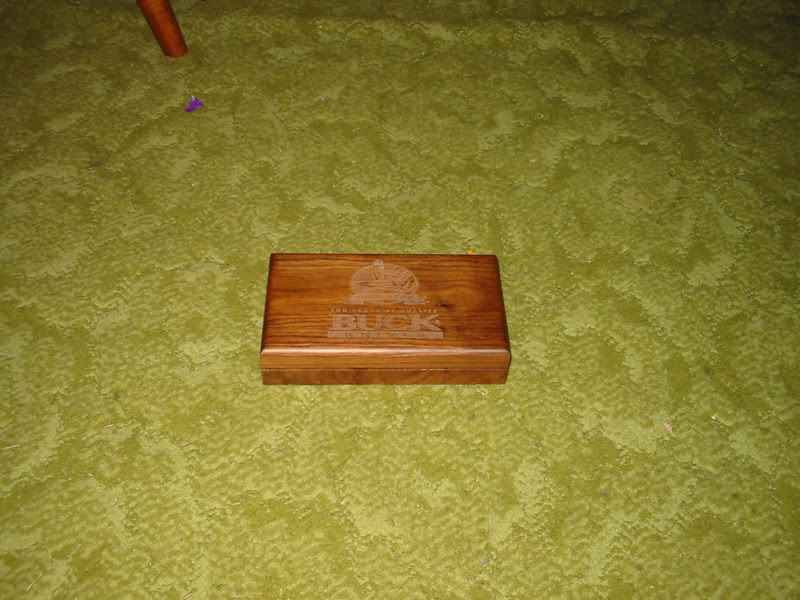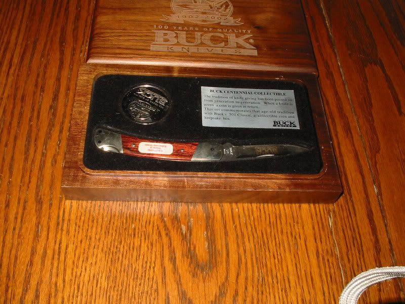 Buck 1902-2002 Commemorative 501 Classic. Comes in a wooden display box and includes a commemorative coin with the knife. $40