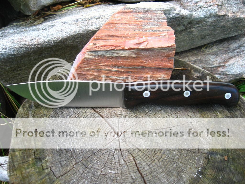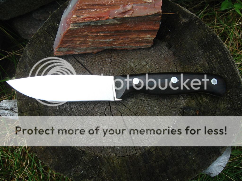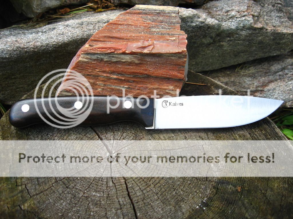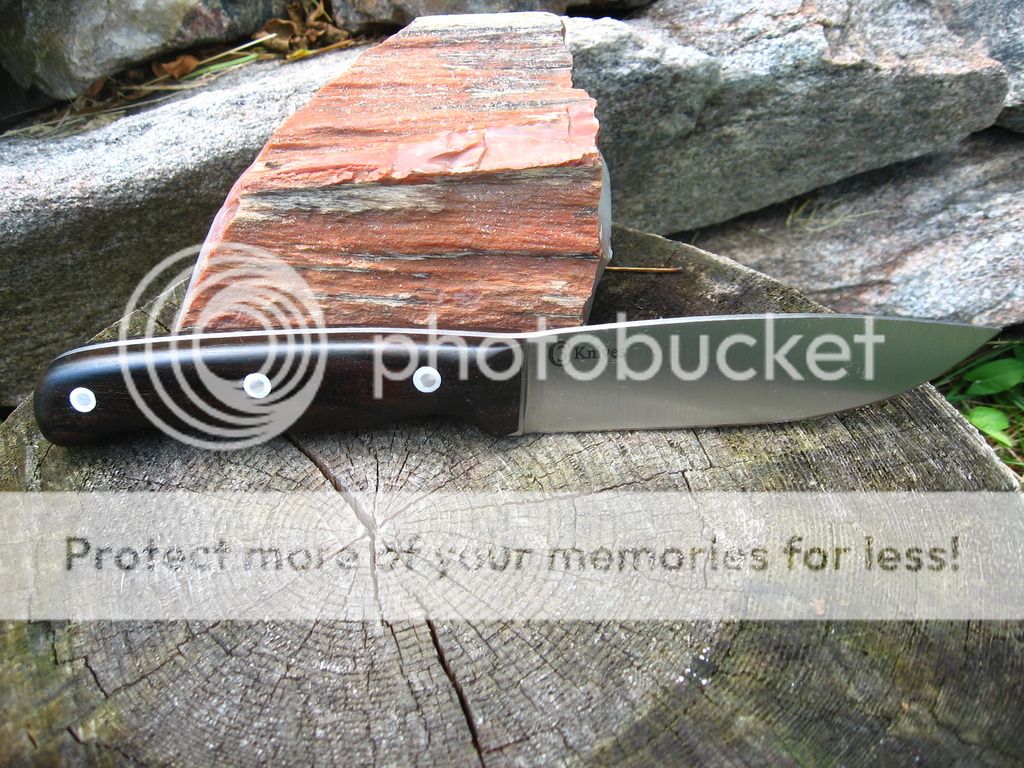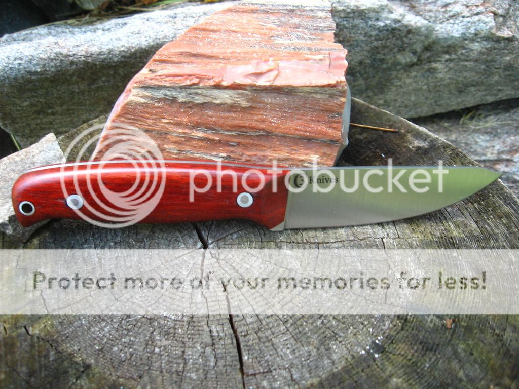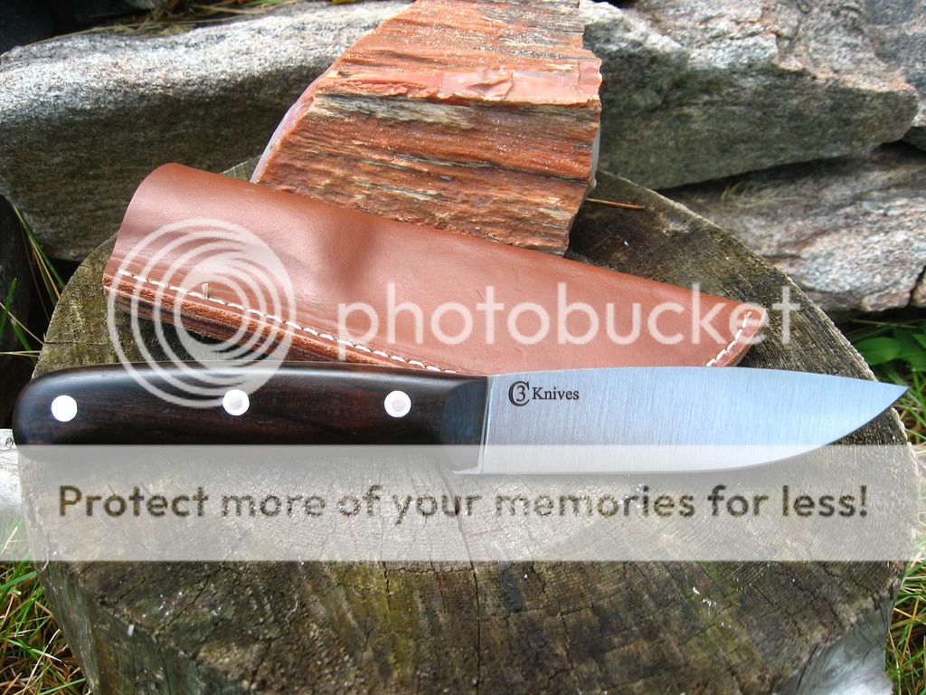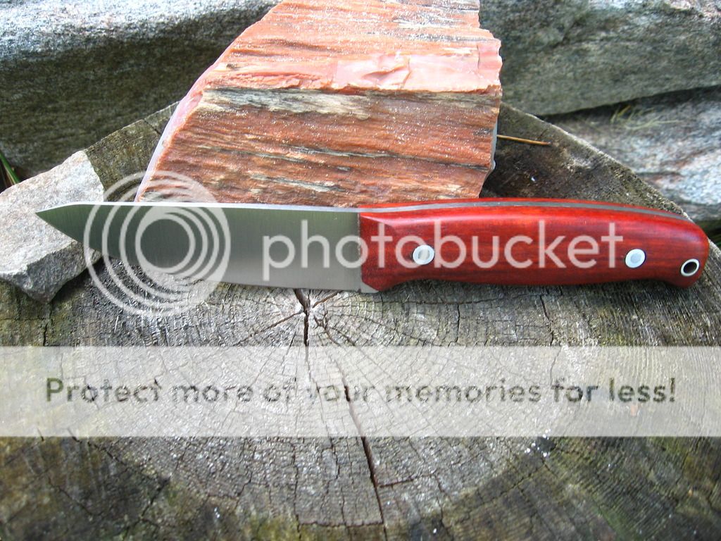 First is a 4.25" blade, .140" thick CPM 3V hunter, 4.6" Bloodwood handle, Heat treat with cryo from Peter's, RC tested at 58, wet formed leather sheath. $140 shipped continental US.