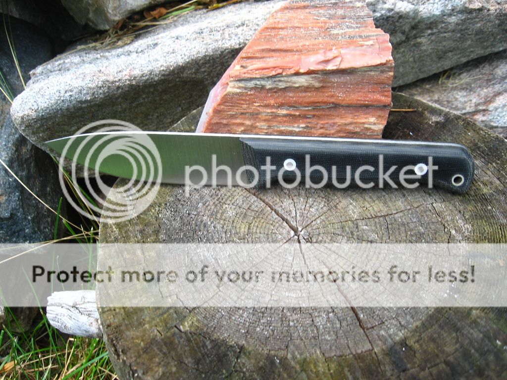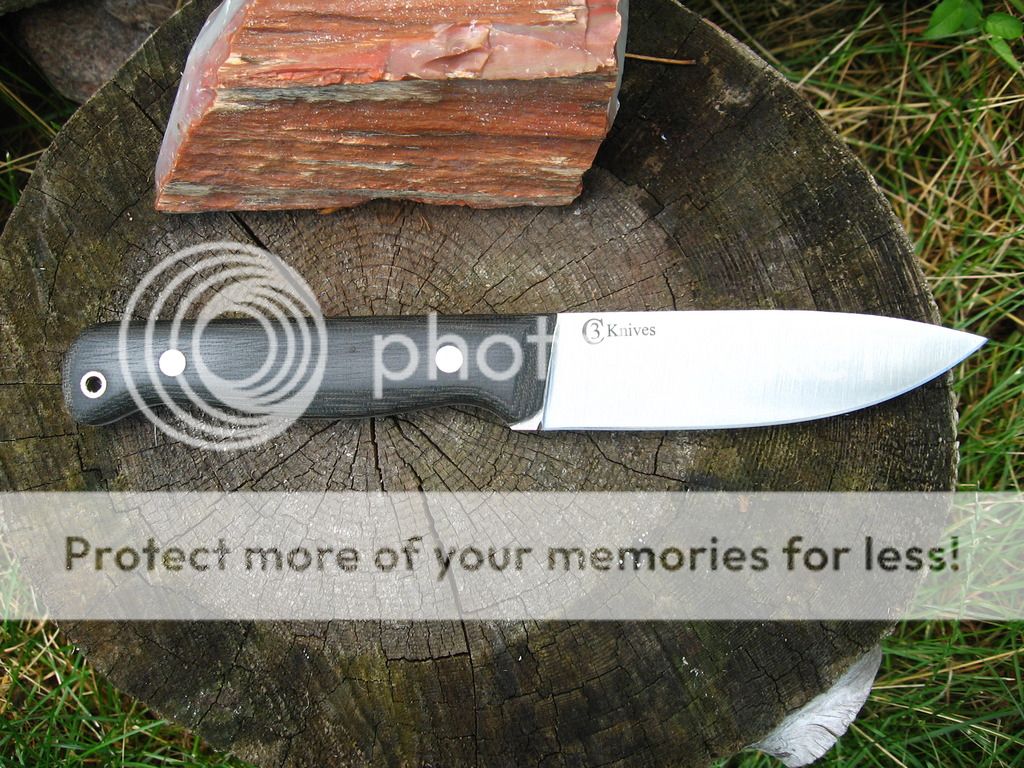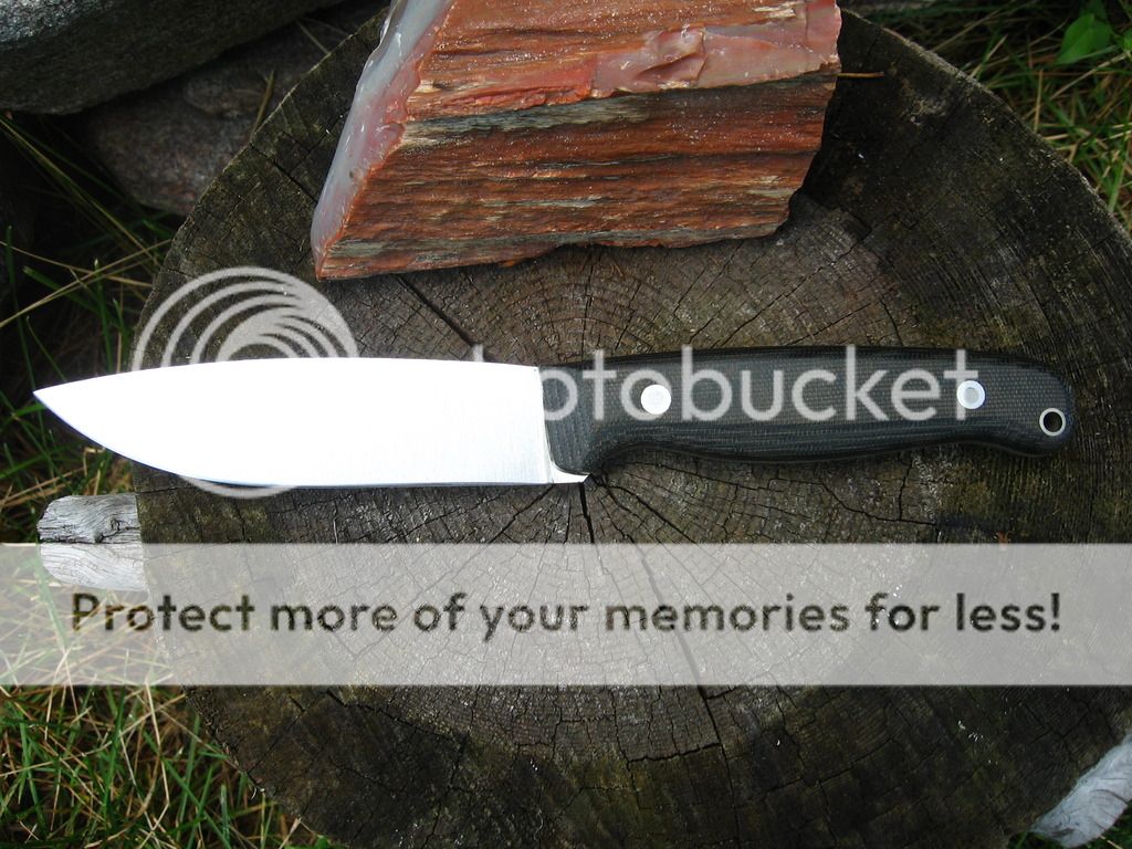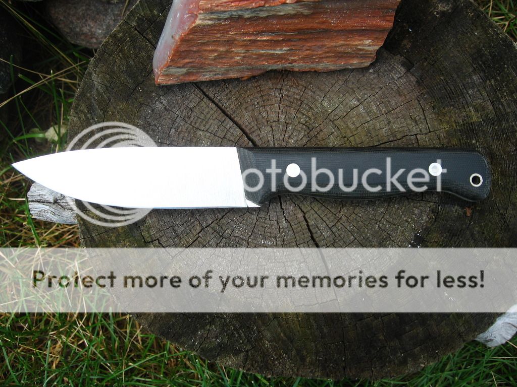 Next is a 4.75" bushcrafter blade in 3V, 4.75" Zirocote handle, RC 58, wet formed leather sheath. Sold shipped continental US.