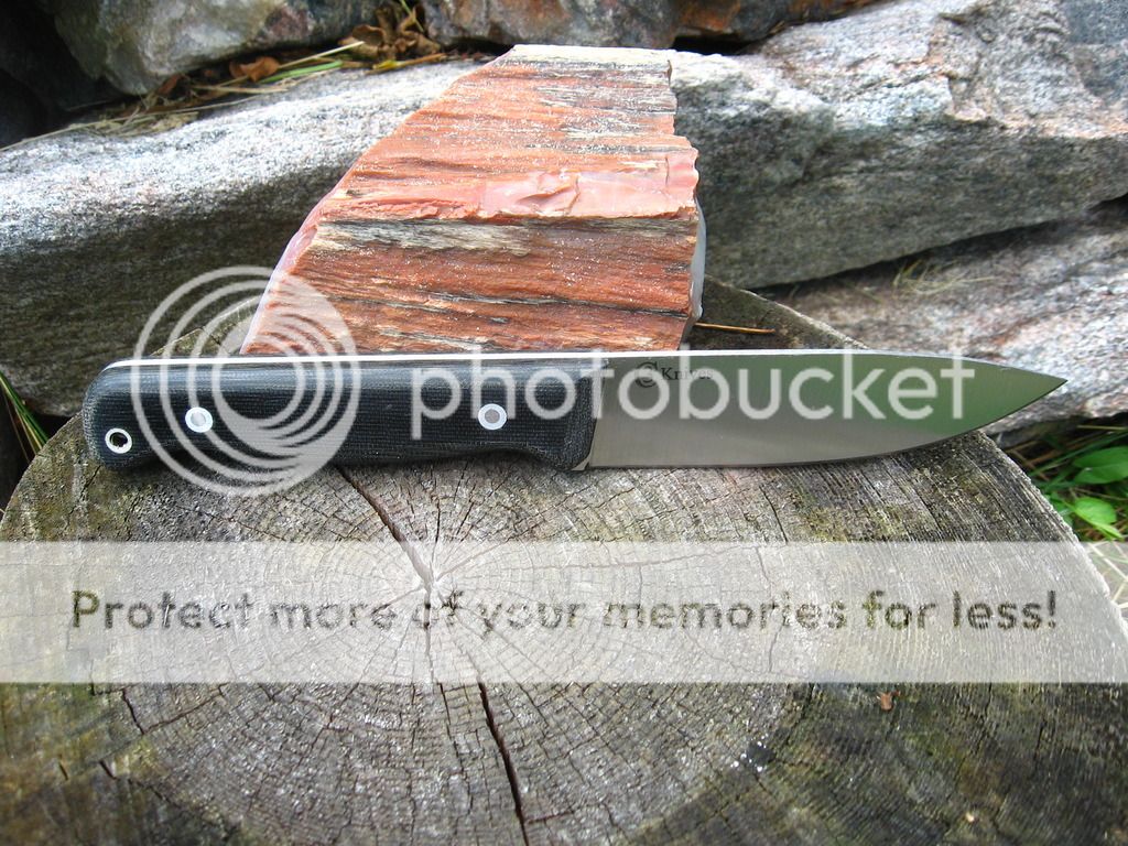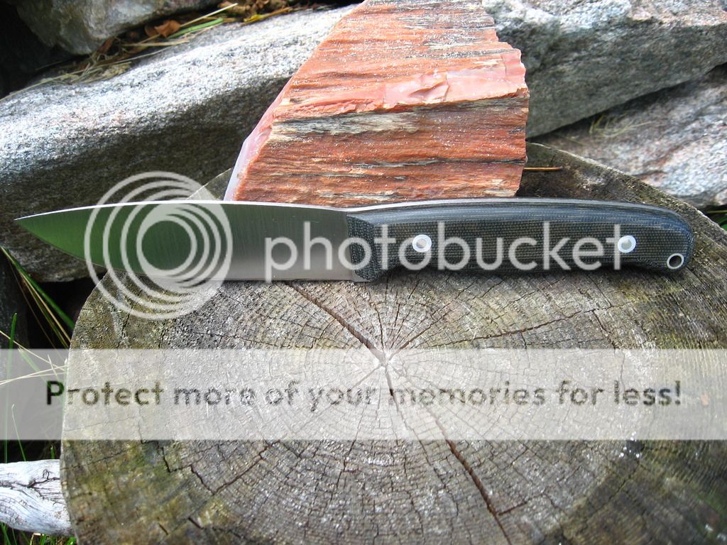Next is a bushcrafter with a 4.75" green camo micarta handle, 4.75" 3V blade, 5/32" stock, RC 58, I will make a kydex sheath for this one. $140 shipped continental US.