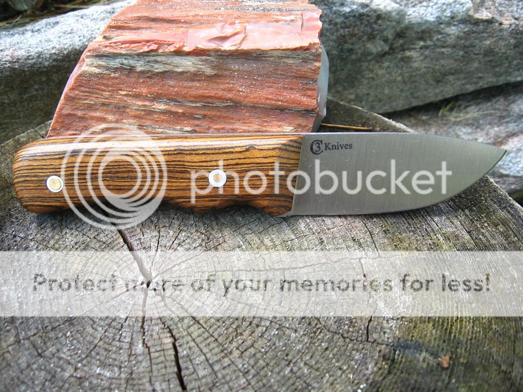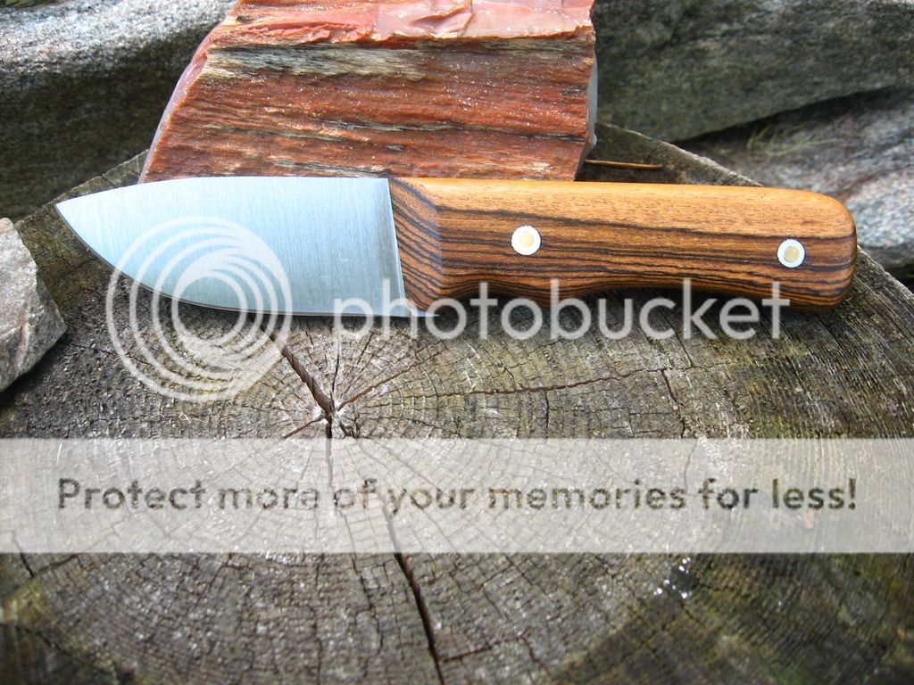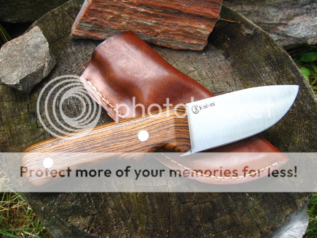 Next is a 3.5" skinner in 5/32" CPM 3V, Bocote handle, 4.5" handle, RC 58, wet formed leather sheath. $140 shipped priority mail in Continental US.