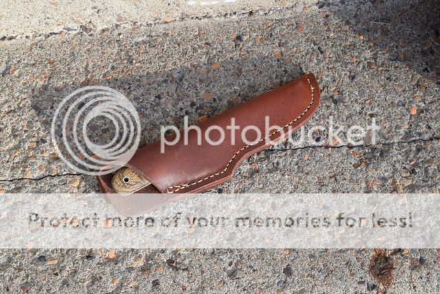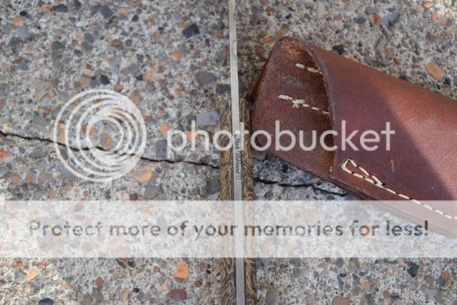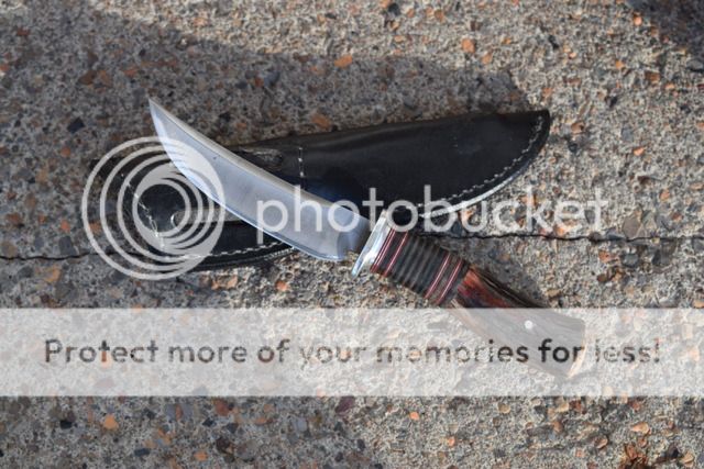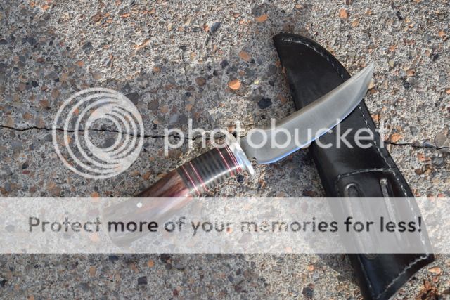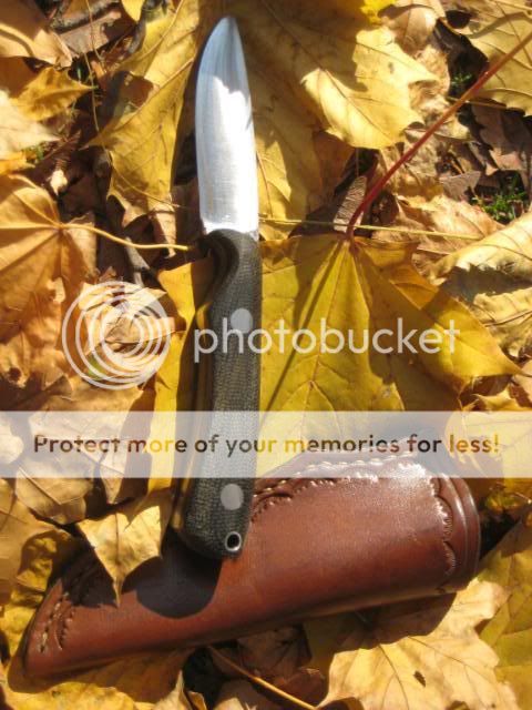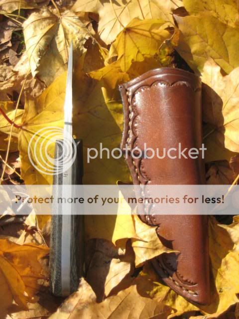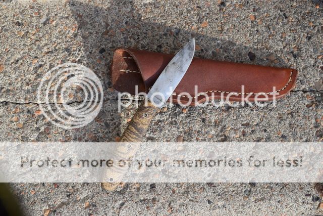 Mark Wohlwend II Drop point, micarta handles. Has heavy patina and light pitting from being used in the kitchen on a regular basis. I rounded the scales, as they were a bit blocky as received for my taste. Comes with heavy duty sheath. Price - $95