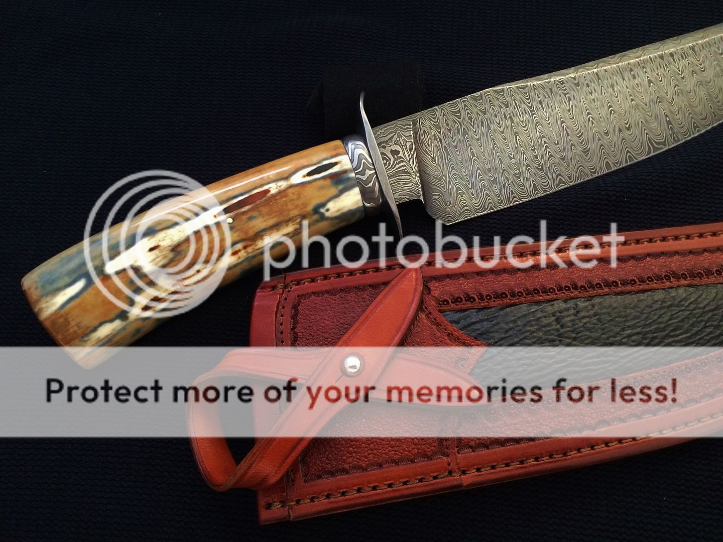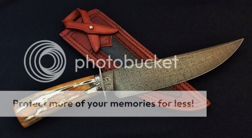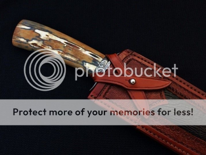 Steve Culver, MS - Matched set of mammoth and Dog Star Damascus Hunters. Engraved guards and pins. Dark rich burgundy leather sheaths with basketweave also be Steve. The mammoth on both is amazing rich colors. I'm selling as a pair for $2,600, including shipping.