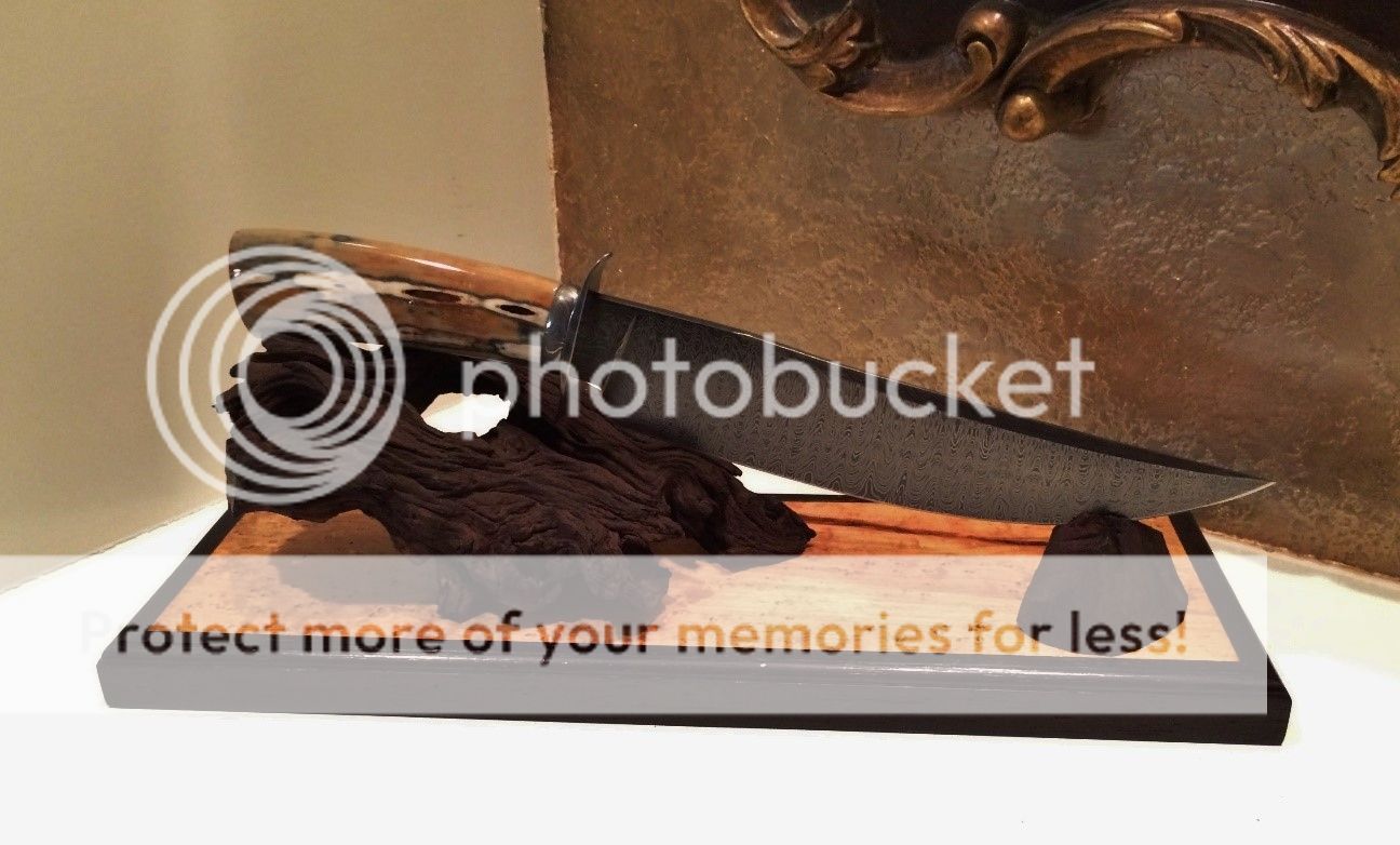 Don Hanson III, MS - Walrus and Damascus Camp Bowie with custom Paul Long sheath, shark skin inlay and custom display stand. This is a unique one of a kind camp Bowie with Damascus spacer and guard. The Walrus ivory has truly special character and colors. Price is SOLD, including shipping.