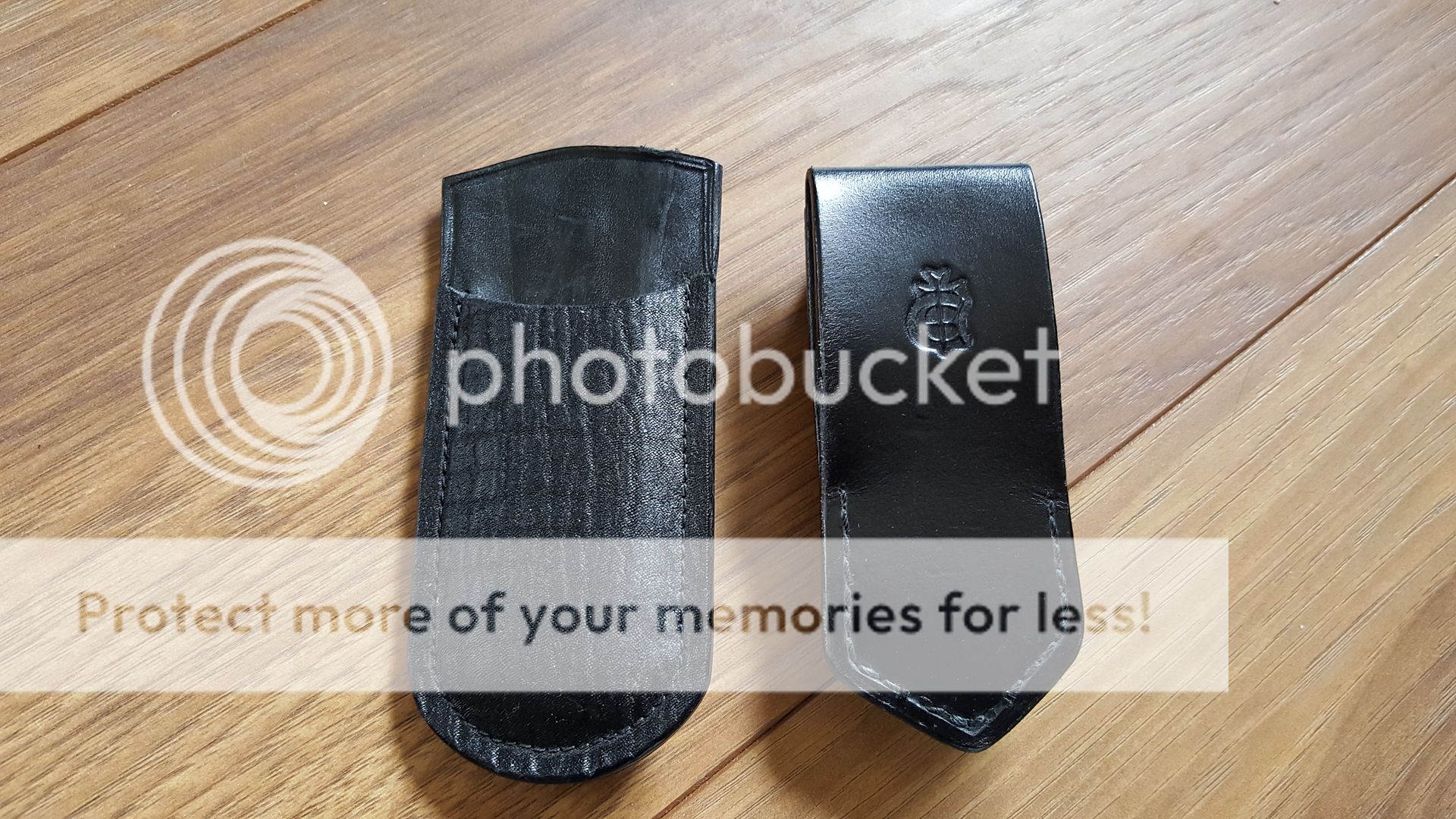 The first one is a paul long slipcase with a WH style pocket clip. It was made to fit a 3.5" xm-18 but fits a sebenza nicely as well. Its sharkskin leather.