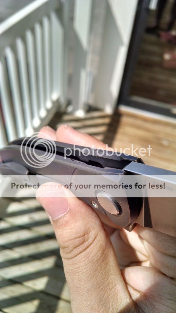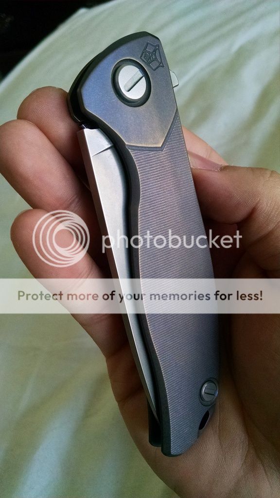 The frame was contoured, milled externally AND internally before being anodized a gorgeous violet bronze. The barrel spacer was also bronzed. As a result of the work, this knife has excellent grip in the hand and weighs an impossibly light 4.125 ounces. Basically an aftermarket custom division.