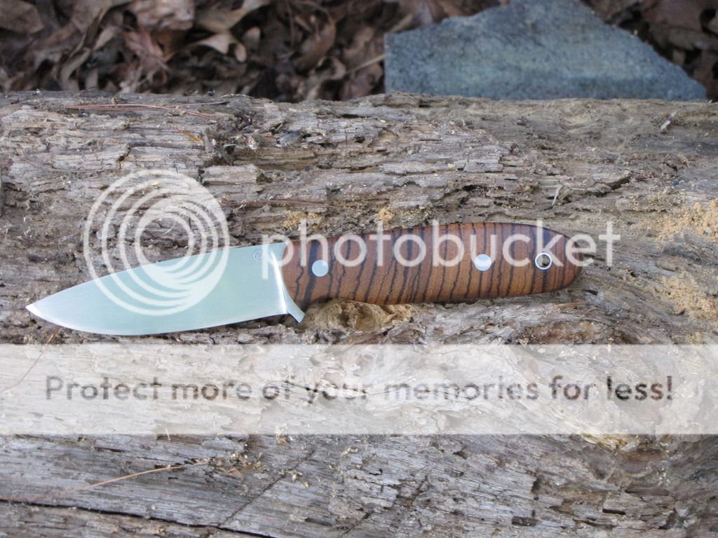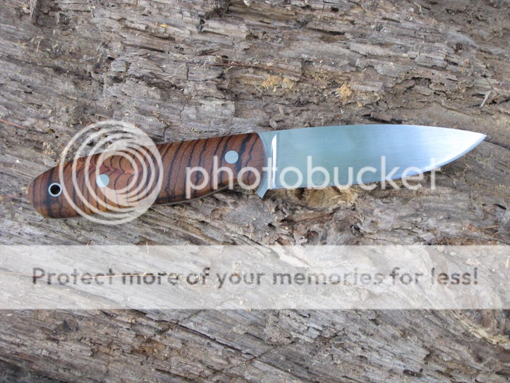 This is the Shoal Creek. It is a new design in 1/8" 52100. The blade is 4". Hand sanded to 400-grit. Heat treated to 59-60 RC. Handle is 4 1/2" with Zebrawood, stainless corby bolts and stainless tube. Comes with your choice of leather sheath.