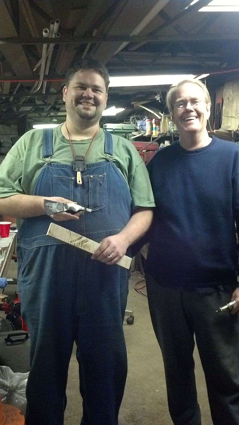 I had another great year this year and made off like a bandit. I am the new proud owner of a knife made by Andy Lewis (If you've seen his work, you know how lucky I am) as well as Shane Wink's personal hunting knife. Oh, and I also scored some killer supplies from Dan: Walrus ivory, India Stag, and curly maple for the Hawk.