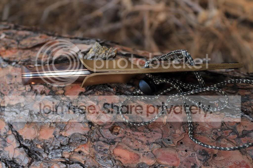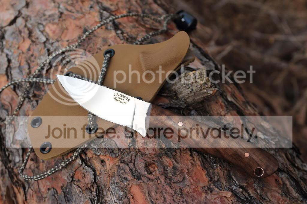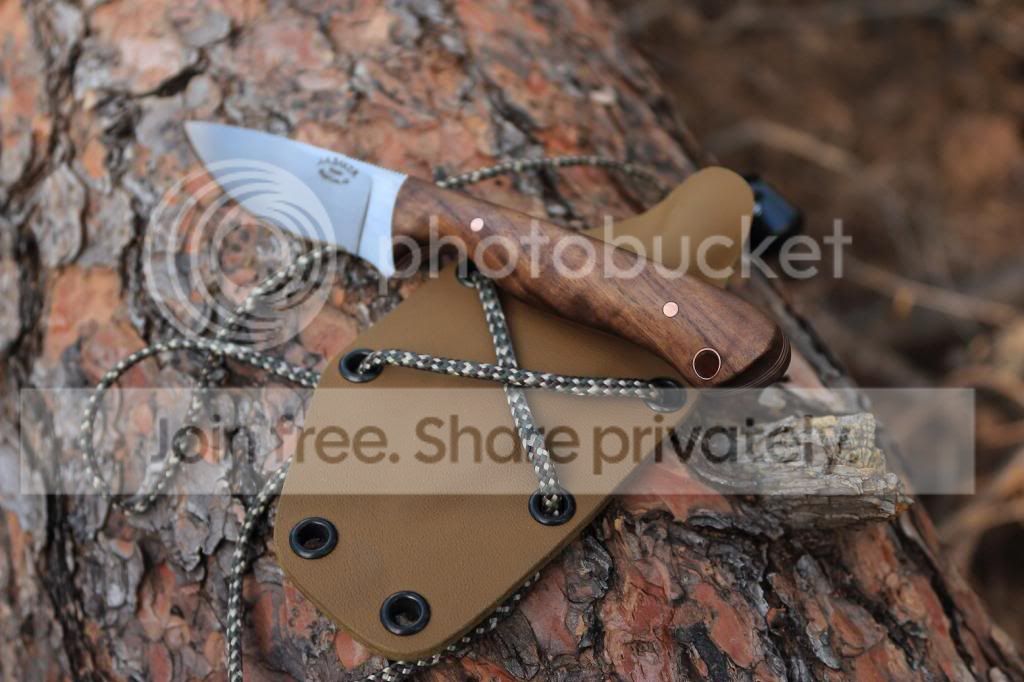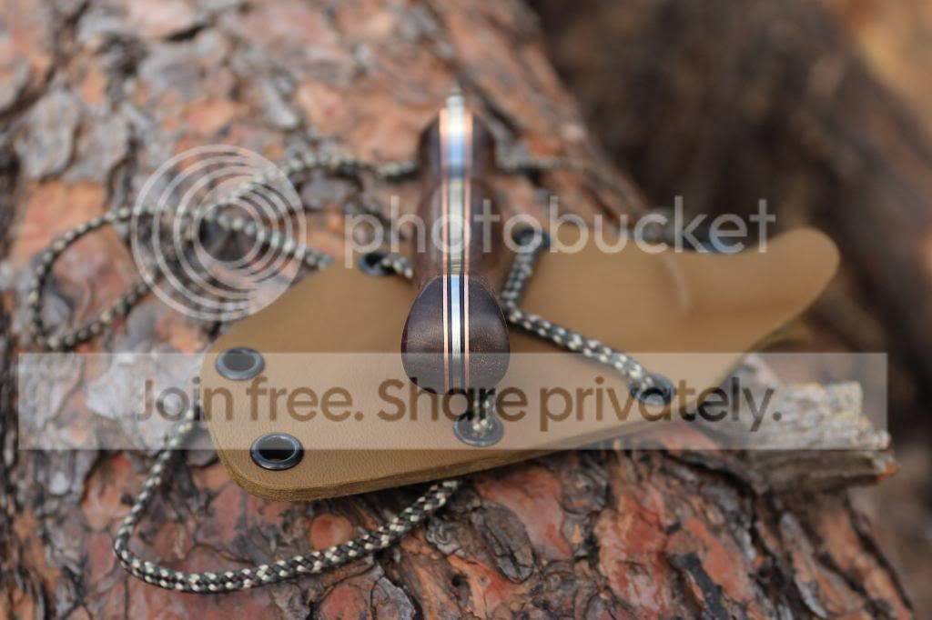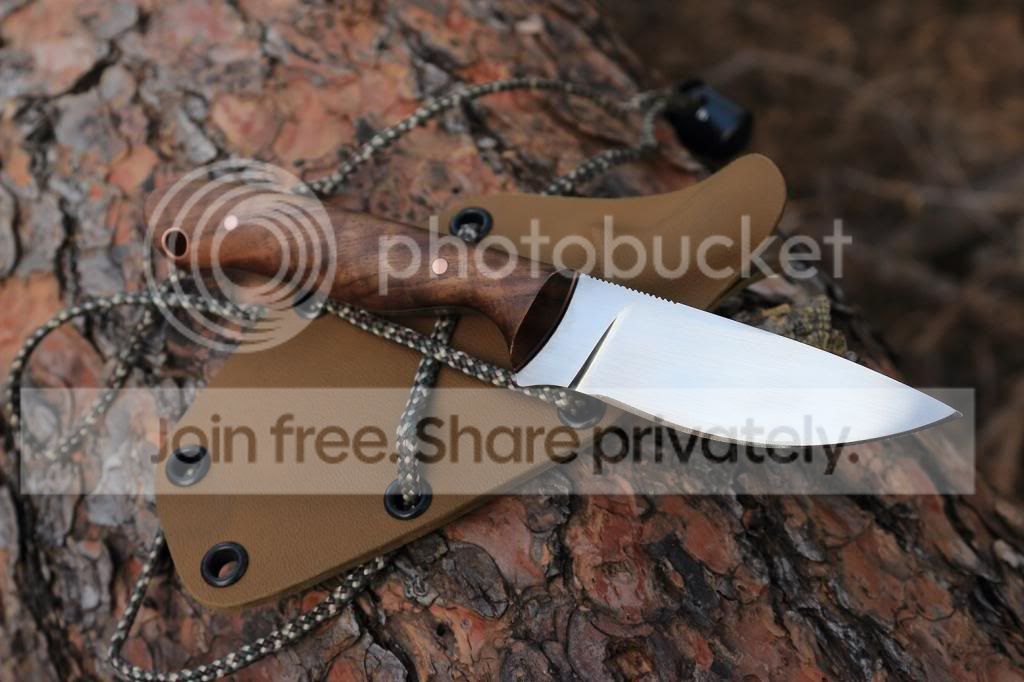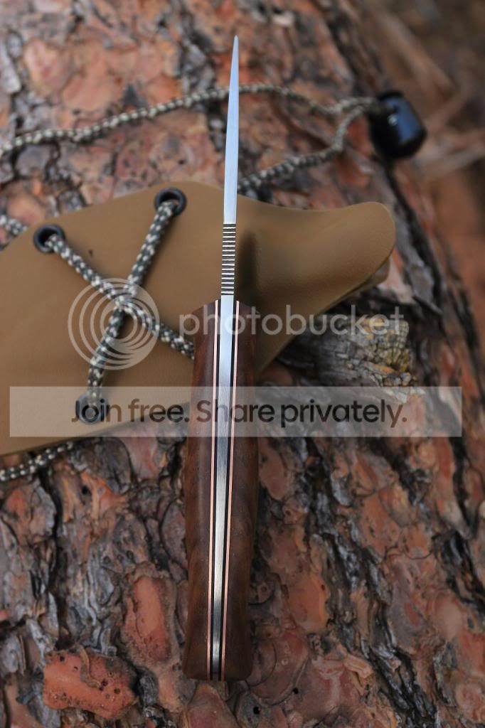 I have up for sale today a Sidekick model EDC/Neck Knife in ATS-34 with a tapered tang and a 3" blade.The scales feature figured walnut with copper and black spacers. The handle has copper pins and tube and is heavily contoured to be comfortable in hand with thumb serrations on the spine for more control. The blade has been cryo hardened and double tempered to 61RC. The coyote brown Kydex sheath comes with an adjustable lanyard and is set up for a large Tek-lok, right or left handed. A dual carry leather sheath is available for this knife as well, but is not included in the price. Thank you for looking, Jeff