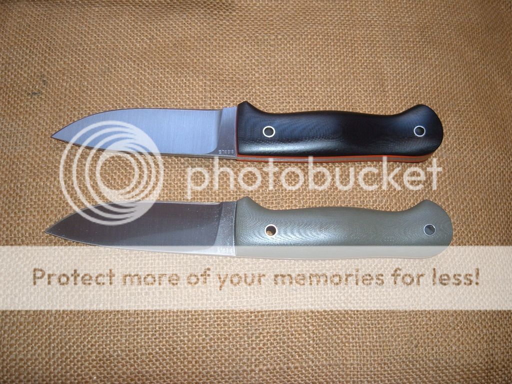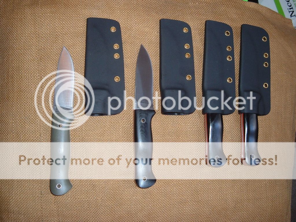 Bushcraft style knives. All are O1. They are 3/16in thick stock. 4 1/8in blade and 8 7/8in overall. OD Green G10 is the only one left. The spines have had the edges broken but I leave the choil area "sharp" for scraping a fire steel. Come with a black Kydex sheath set up for a large Tek Lok(Not included). Price is***Now $200*** shipped in the US.