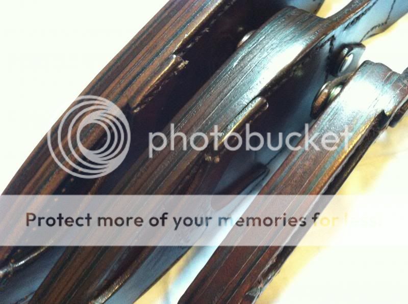 Hell, how bout this to blow your mind? A kydex lined leather sheath, that's ALSO lined with leather??? IOW's, you've got 3 layers! First up, is a thin layer of leather deep inside almost touching (but not quite) the blade, for scratch prevention. Next, you've got the main kydex body of the sheath, for ultra tight retention. Possibly with lightening slots throughout to keep this tri layered sheath's weight down. Then, finally, for those who want the look of leather, you coat the outside of the kydex with leather, thus resulting in a sheath that looks like the kydex lined leather sheath above. Wheeew! Was that confusing enough for everyone????