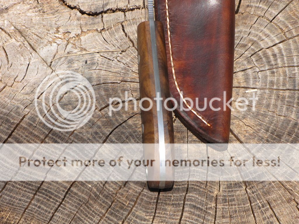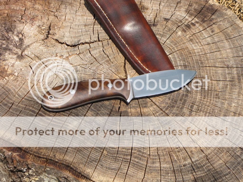 Here is a skinner in 1/8" O1. Blade is 3 5/8" long. Hand-sanded to 400 grit. Spine jimping. Heat treated to 58-59 RC. The handle is 4 3/8" with stabilized crotch walnut, stainless corby bolts and a stainless tube. Comes with 7-8 oz leather sheath.