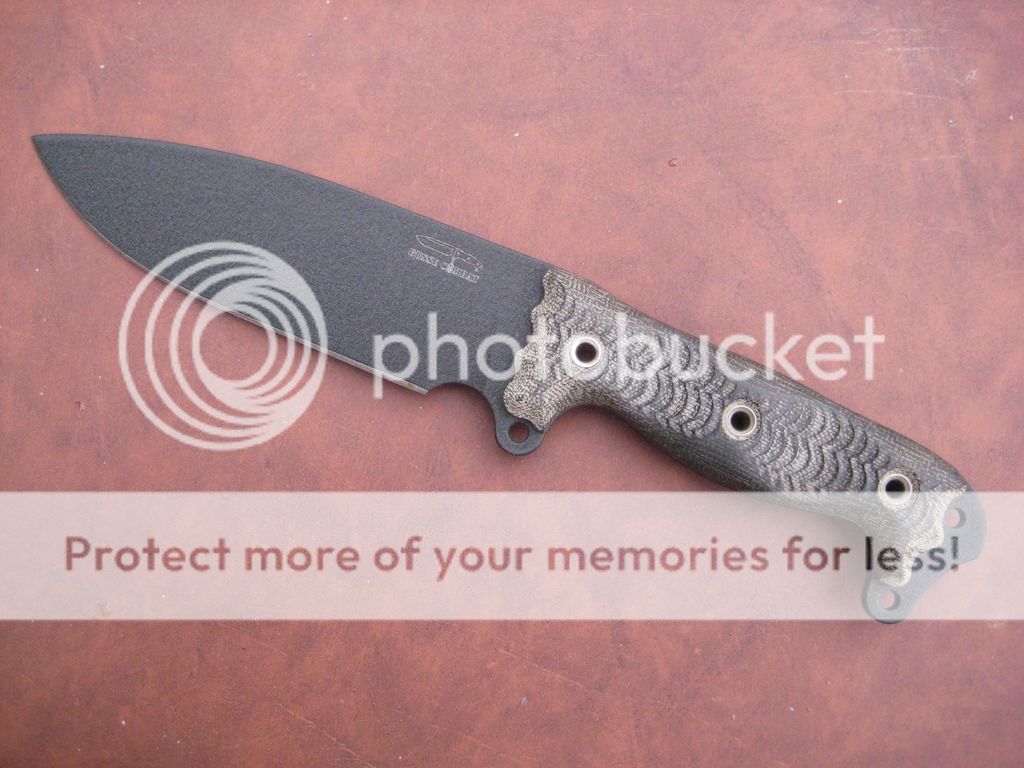 Skinny ASH1 (.20 thick) with black coating and black canvas micarta. Unused and unsharpened. Comes with Busse tactical cardboard sheath. Price is $450.