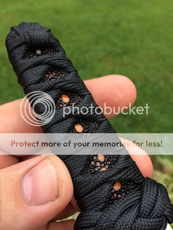 Black tsukamaki handle with a dark chocolate brown row stingray skin.