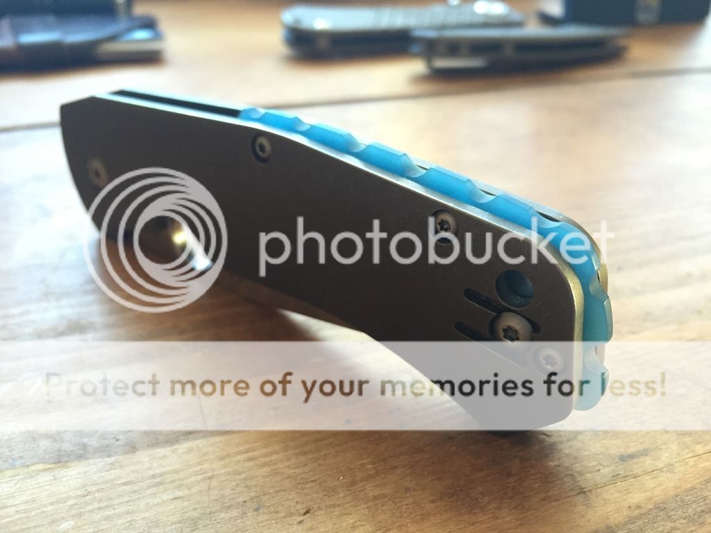 Another awesome blade designed by Marcin. This guy has seen much pocket time and usage. Lots of snail trails, minor scratches, and some wear under the pocket clip on the scales. This guy came red lock tighted and I didn't allow the heat gun to heat it up enough before attempting to take the pivot out. Slightly marred it up in the process. *sigh