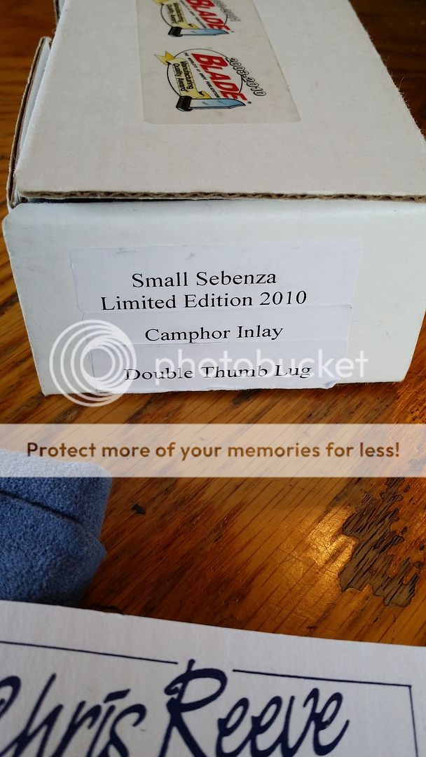 Up for sale is a small 2010 annual with camphor inlay and factory double lugs. Knife has never been used or carried. Includes all paperwork, original box, cleaning cloth and lanyard. Asking $950 TYD paypal, but reasonable offers and trades will be considered. First "I'll take it" posted in this thread gets it. Please feel free to PM, email or text me for any additional information or pics to avoid cluttering the thread. My email is trexmix94@gmail.com and my number is 618-741-8269