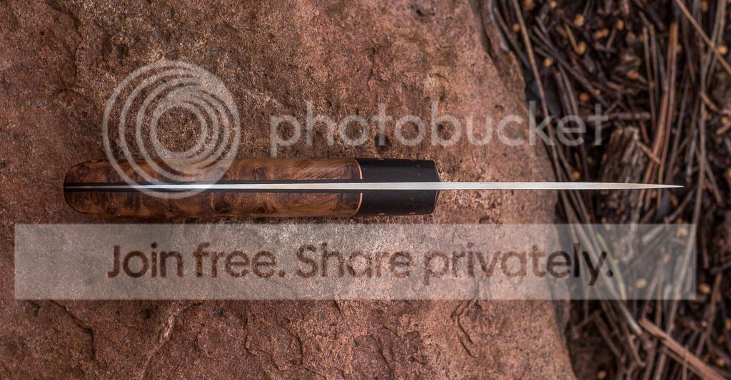 Here is a new model "Mako" pocket/neck fixed blade. I added a sort of choil to the butt and angled it to get a comfortable full 4 finger grip on a knife only 6 3/8" long with a 2 5/8" blade. This one here has a satin finished AEB-L blade @62RC with a tapered tang terminating to .010" at the butt. The handle has black G10 bolsters and spacers with copper pins/accent and stabilized Arizona juniper burl. The tooled pocket sheath is lined and has a stitched in stainless clip and rattlesnake skin inlay. Thanks for looking.