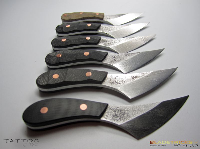 tohubohu Joined Nov 1, 2005 Messages 423 Jan 14, 2014 #1 Hi, I just made some small knives. They all share the same shape with an upswept blade, but made some different scales. 4,65" OAL, 1,8" edge,6150 spring steel, black g10 / micarta scales and copper pins. Thanks for watching