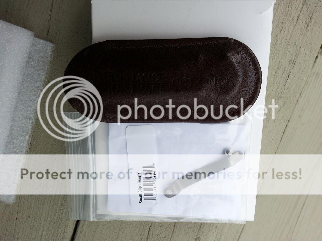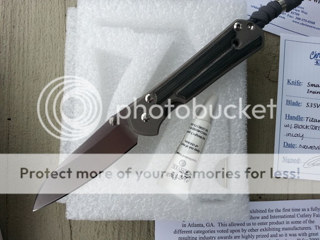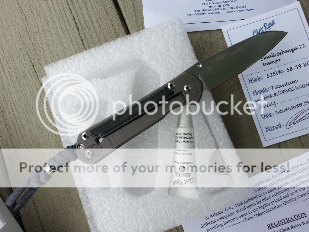 I have a small micarta insingo sebenza for sale. This is the smoothest knife i have ever handled. Perfectly centered and rock solid lock up. It has a few very light snail trails and a rub mark from the pocket clip, but otherwise it is in excellent condition. It has been used very lightly and mostly carried in a pocket slip. It has the original edge and is very sharp. The box has a small tear in one corner.