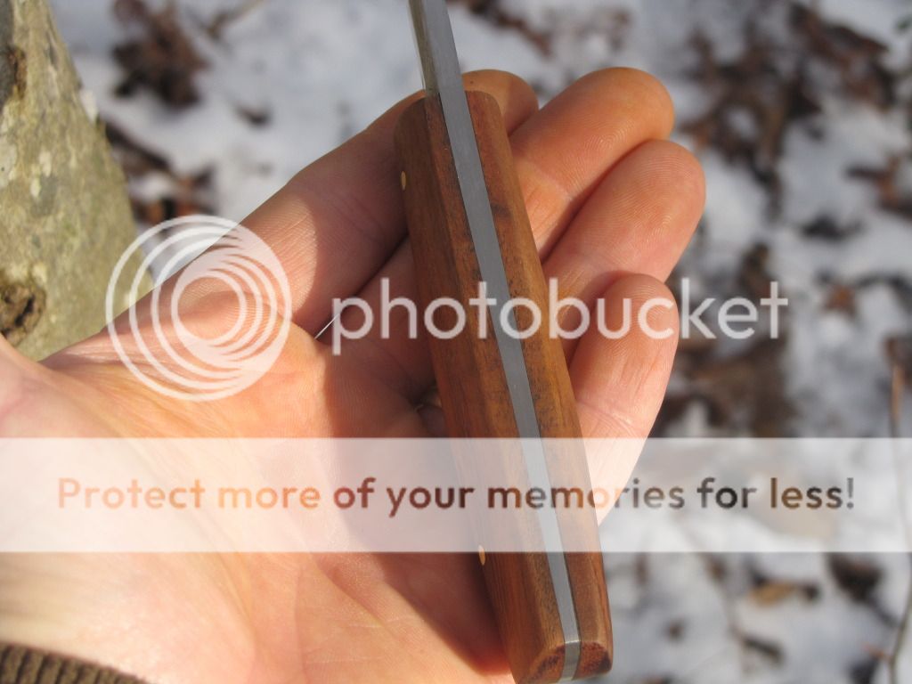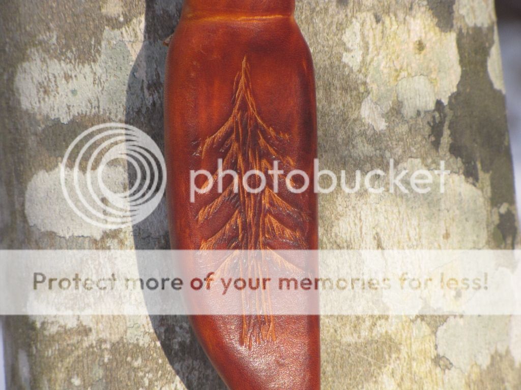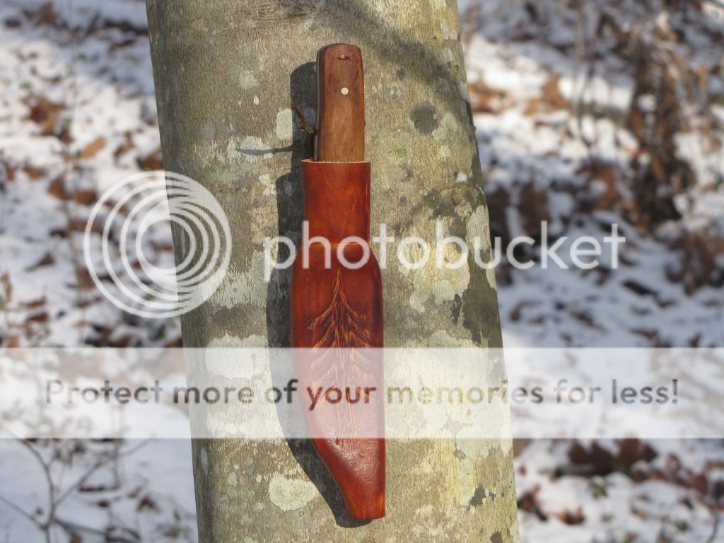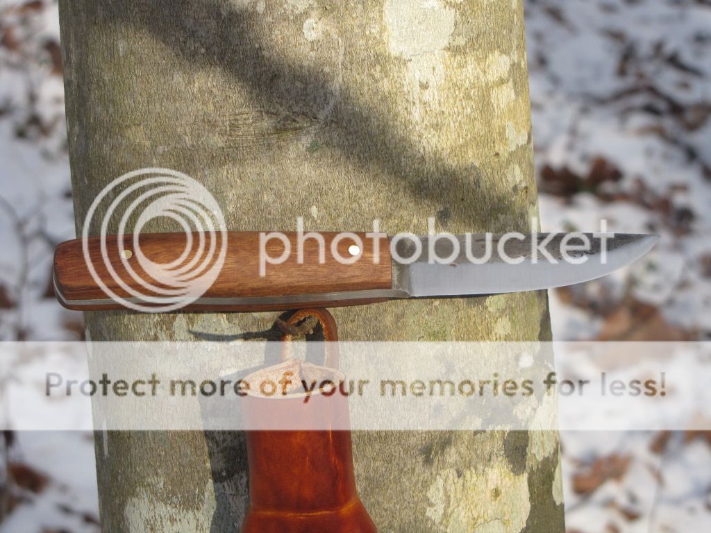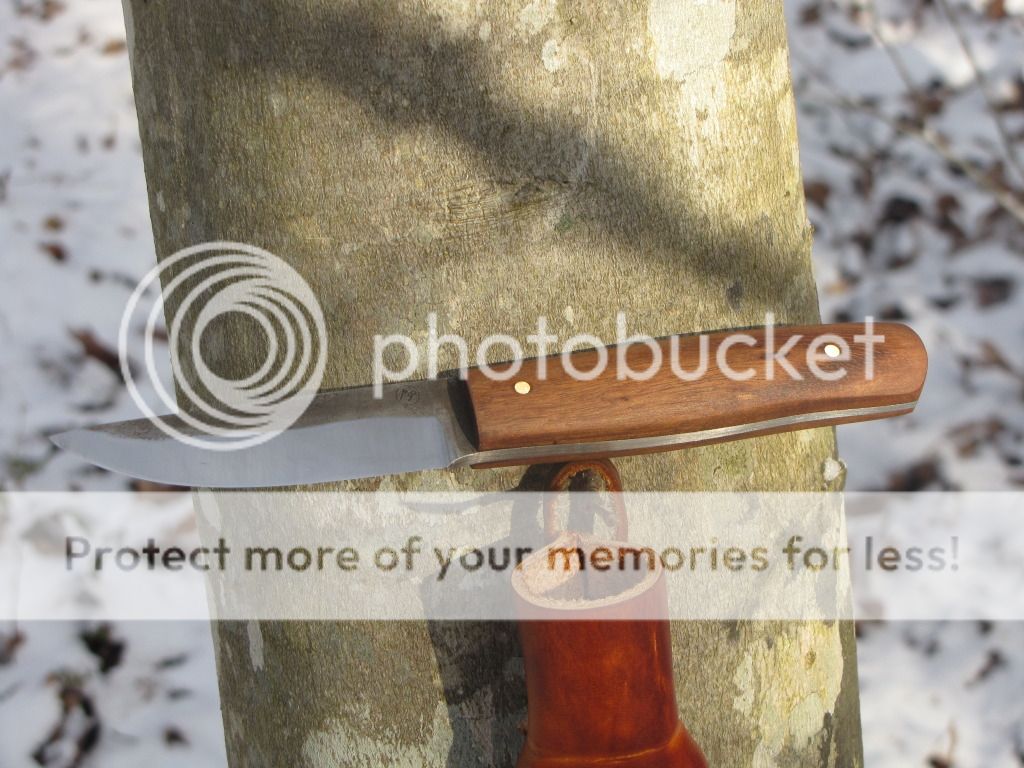 Here is a small Puukko forged from 52100. The blade is 3 1/4" long and 13/16" at its widest. Scandi-grind with no secondary bevel. The handle is 3 7/8" with Brazilian tigerwood and brass pins. The sheath is Scandinavian style with a 7-8 oz vegetable tanned insert and covered with 7-8 oz vegetable tanned leather with a tooled tree.