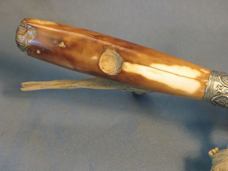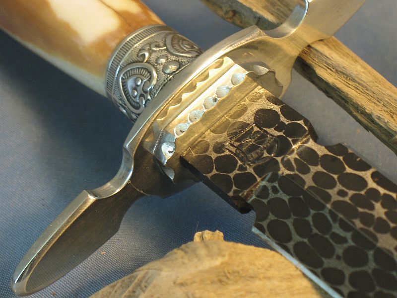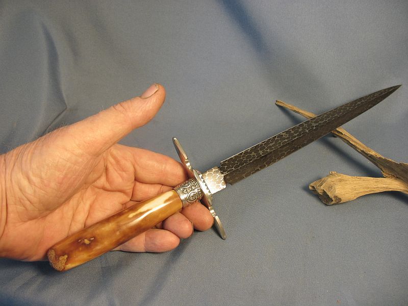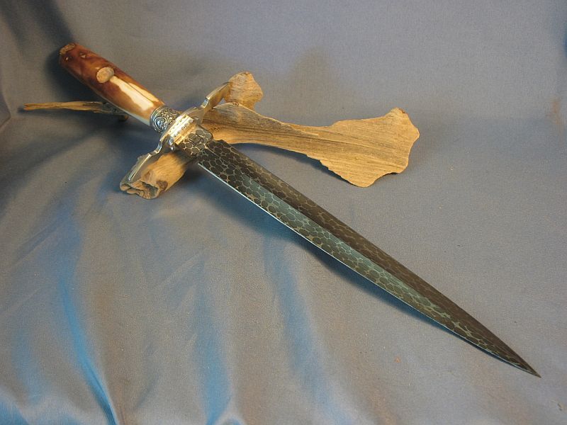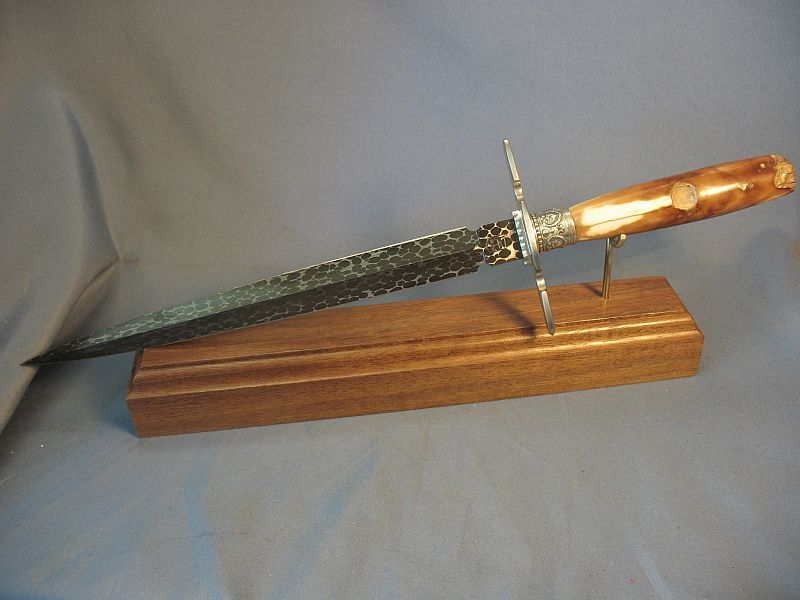 Here is one I just finished that is like a jewel. The handle is a artifact fossil Walrus from private native lands that was washed up on the beach and used by an Siberien Eskimo before America owned Alaska and used as a fire starter, hide scraper and the end in the ferrule used as an ice tester (imagine the story it could tell considering it is beach washed up). The end that was a scraper is as it came out of the ground as is the inside of the fire starter. It was found and collected by an Eskimo of today who sold it to my supplier. Blade length is 9 1/4 inches and overall the dagger is 14 1/8. Sterling ferrule and nickel silver fittings with my Snakeskin Damascus made with 52100 steel ball bearings and 4800 KC steel. It is sharp and a wicked point. Comes with the stand of Black Walnut. The handle is solid and out of the ground for 20 months. More pictures upon request. One of my finer ones This dagger is "SOLD" plus 12.00 priority mail. My paypal and e-mail is dangraves4923@earthlink.net Thanks.