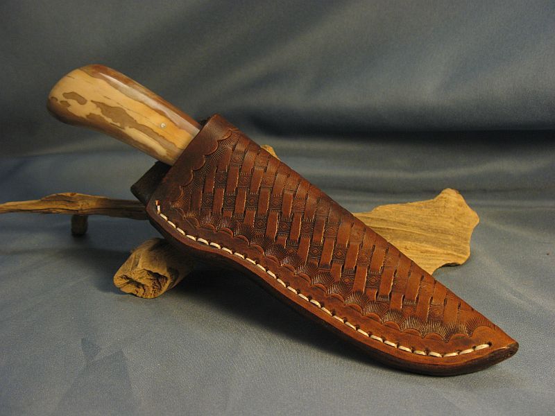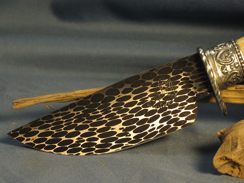 Hello folks. Here is a snake skin Damascus knife which is made out of 1/8th inch ball bearings and 4800 KC steel. Makes for a hell of an edge holder so its not just about the looks. Ball bearings are very high carbon steel made to be tough. This one has a blade that is 4 1/8 inches and overall is 8 3/4 inches. The blade is a 1/4 inch thick at the guard and tapers to point. Very comfortable in the hand. The handle is fossil walrus ivory and the sheath is included. Hope you like it as I enjoyed making it. It id SOLD SOLD plus 6.00 for priority mail. Cant ship to New york and New Jersey. There is a ban there. My paypal is dangraves4923@earthlink.net