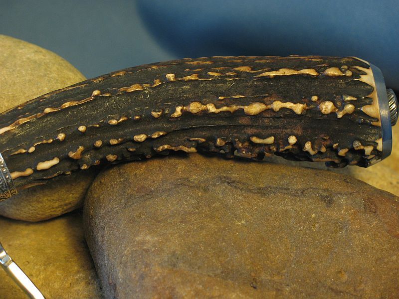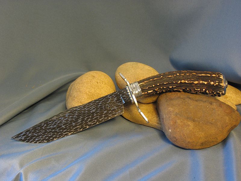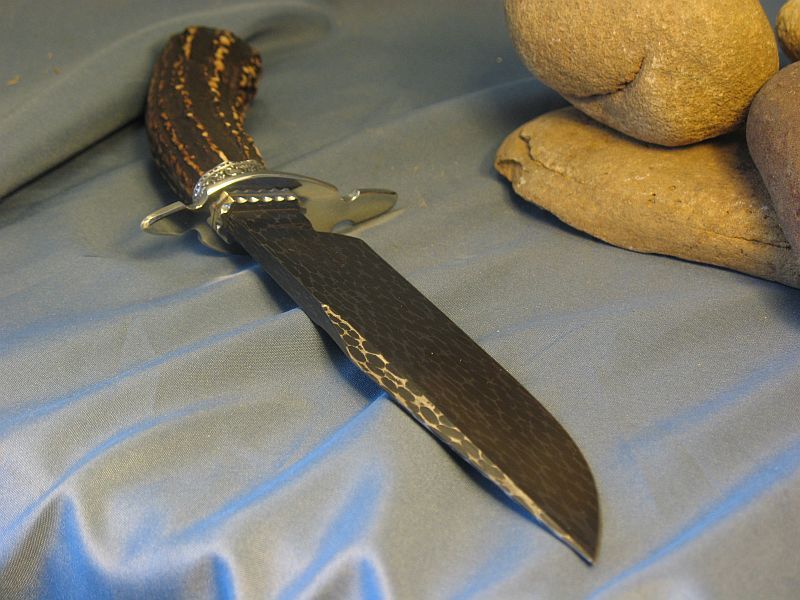 Nice Bowie or fighter with a presentation cut of stag. Balanced right at the guard. It has a 6 3/4 inch blade and is 12 inches over all. Nice harpoon grind false edge. New Sambar stag that is good for either left or right. Sheath comes with it. I would like "SOLD" for knife and sheath with free mail in USA. My e-mail and paypal address is dangraves4923@earthlink.net