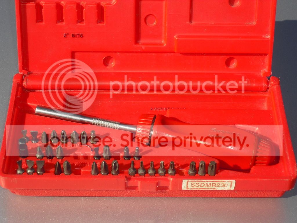 Snap-on Ratcheting Screwdriver kit $60.SOLD on another forum Used, but in great shape. Ratchet mechanism works perfectly in both directions and locks tightly, no rough spots during use. The Ratcheting handle is ##SSDMR4A in a #PB55 case. (Not sure what #SSDMR230 label means.) Some of the bits are Snap-on 1/4" hex bits (American-made, probably Apex), but the others are a mix of domestic & import brands. All are good quality - I won't buy junk when it comes to tools: too many hard lessons learned the hard way.
