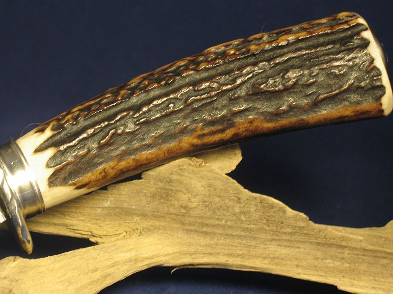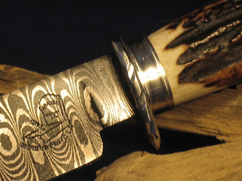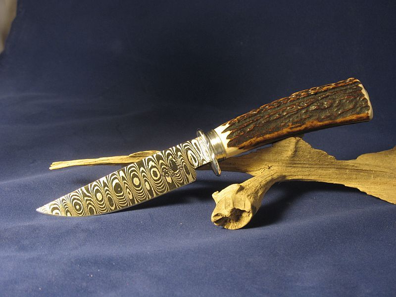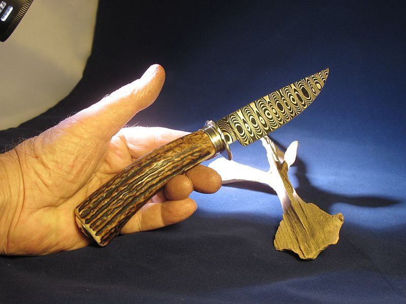 I just like that word "SNAPPY", anyway here is a another one that I just completed. Fittings are nickel silver and a fine cut of amber Sambar stag. Carved butt cap. Well balanced. I made the Ladder pattern Damascus out of 1080 and 15n20 steel. Blade length is 4 1/2 inches and overall length is 9 inches. Comes with sheath.