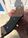 This is the first ever production run of a normally priced $600-700 custom design by Sniper Bladeworks. Introducing the DMF folder 8.5" overall, frame lock stonewashed 1095 high carbon steel blade with beauitful PVD brass coating and carbon fiber insert on the scales. A very robust knife but not so heavy that you wouldn't want to carry it everyday. The blade shape and contours are beautiful and the overall fit and finish is outstanding.