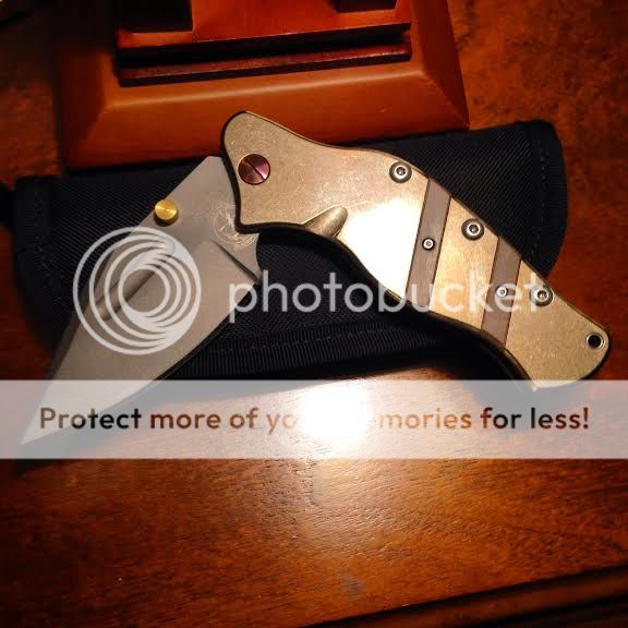 This LPC features a clip point, S30V blade with a false top edge and single thumb-stud that is bronze colored! The handle scales, barrel spacers, and pocket clip are anodized titanium! Blade locks up tight with no play and is centered when closed. Knife is new from maker! Was custom ordered!