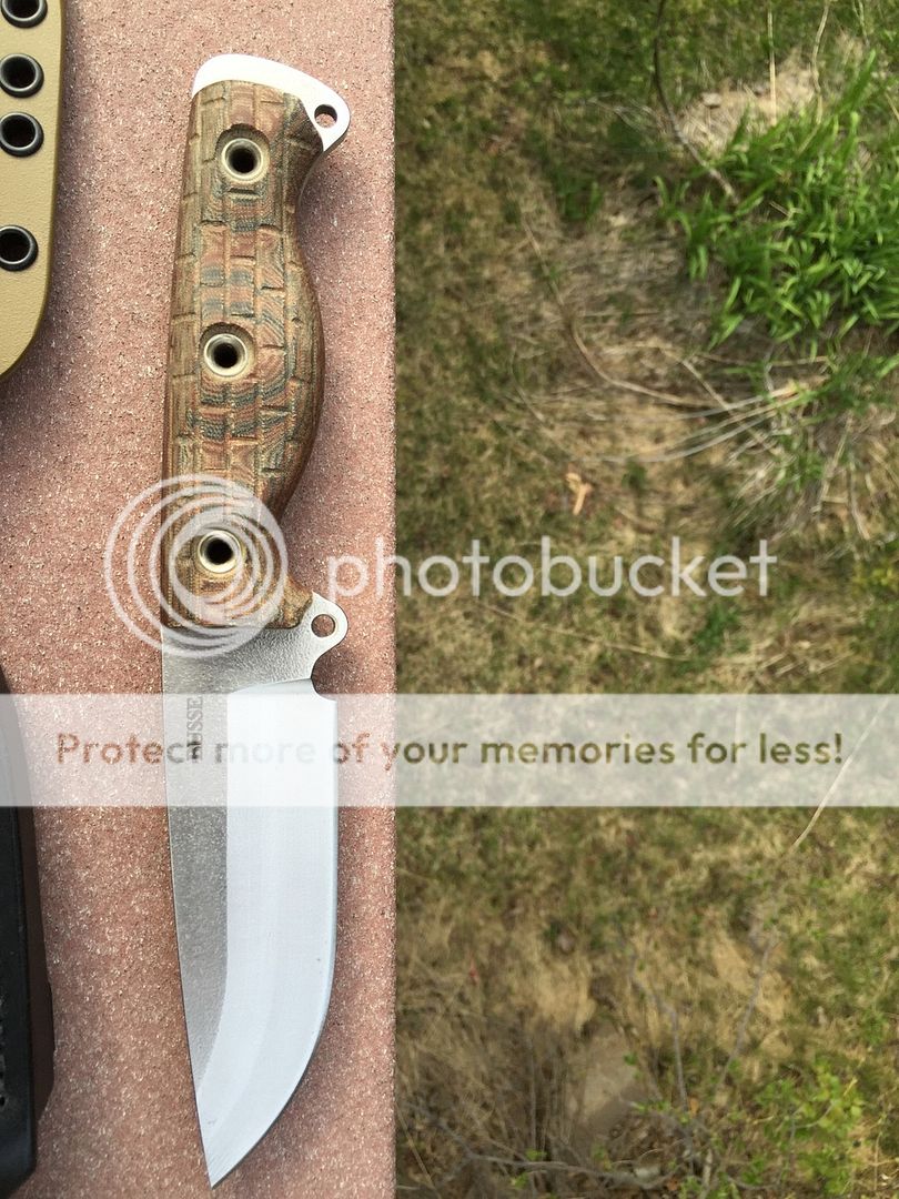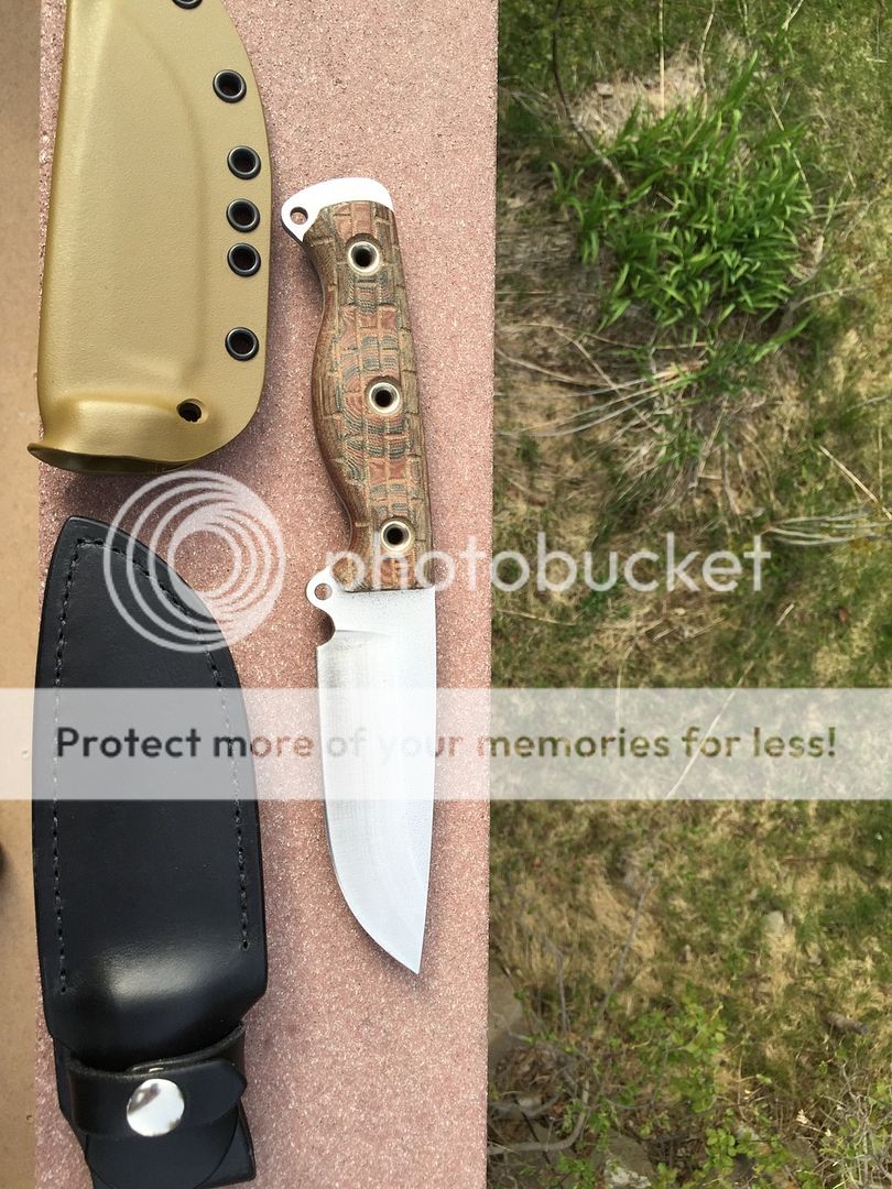 I just got this SOB on a trade as well as a couple other similar sized knives... They are staying, this one is going. Never been used (but has been stropped), tigerhide scales, comp. finish (with a couple tiny specs of what looks to be rust), a BuyBrown kydex and a ChuddyBear leather sheath. $375 shipped in the US. If you buy in the next 24 hours I will throw in a Benchmade tomahawk for an extra $75. If it passes 24 hours, the tomahawk will be given away in the general forum.