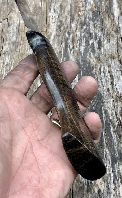 A really nice hunter up for grabs here today. It's my Tamarack hunter profile in CPM 20CV steel at RC61 with cryo treatment The guard is two toned carbon fiber weave and the handle is dyed, stabilized curly Koa. This one is light as a feather and will make an outstanding slicer.